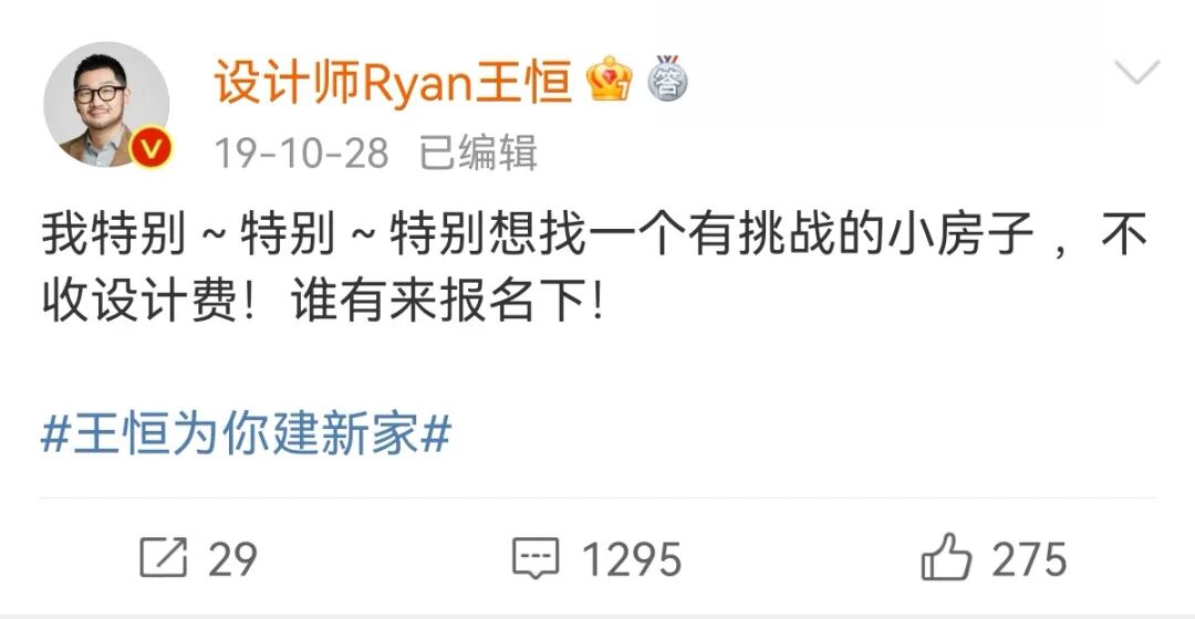 说起这个栏目的产生,还得来源于王恒老师一次和朋友的聊天,聊到对“生活方式”的理解,对家的“功能性”的定义,以及做设计时想赋予作品的一些“情怀”。于是,王老师发了这样一条“心血来潮”的微博: