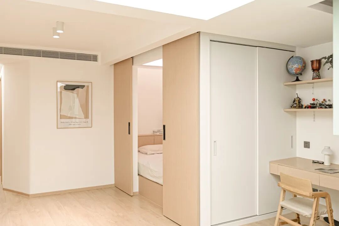 现在,拥有了独立的儿童房后,主卧可以重新作为夫妻二人的专属空间。我们将原阳台包入了室内,将整个主卧功能平移且压缩。