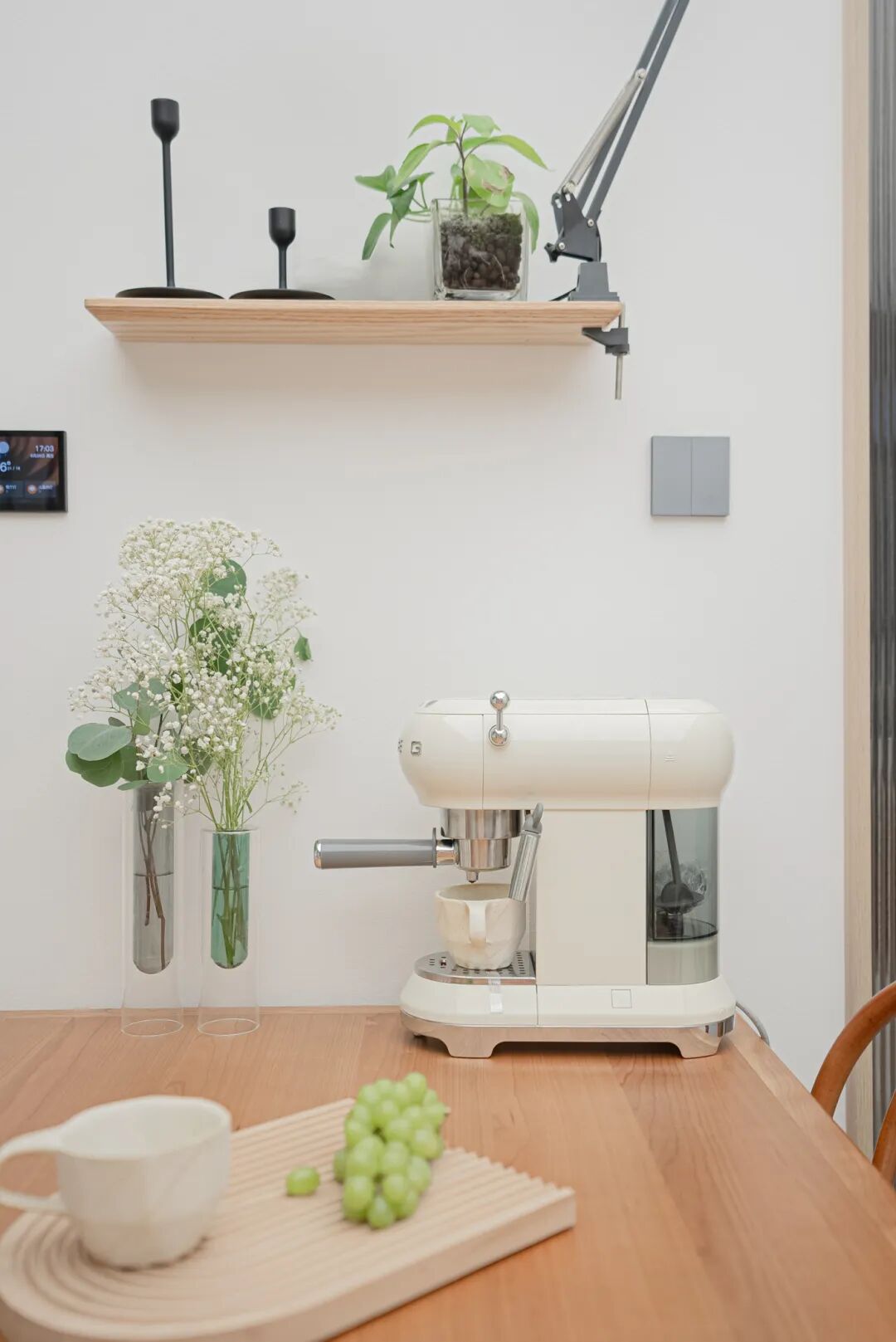 客厅的白色墙面采用硅藻泥材质,在室内空气过于潮湿时,硅藻泥就会吸入空气中的湿气,在干燥环境下排出,有助于更好的调节空间的温湿度平衡,营造一个舒适自然的家居环境。