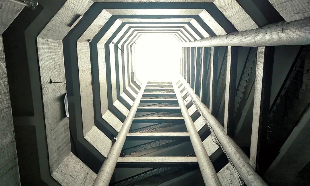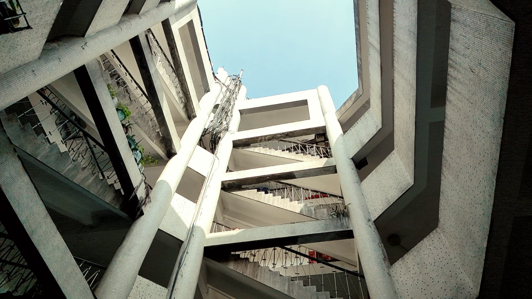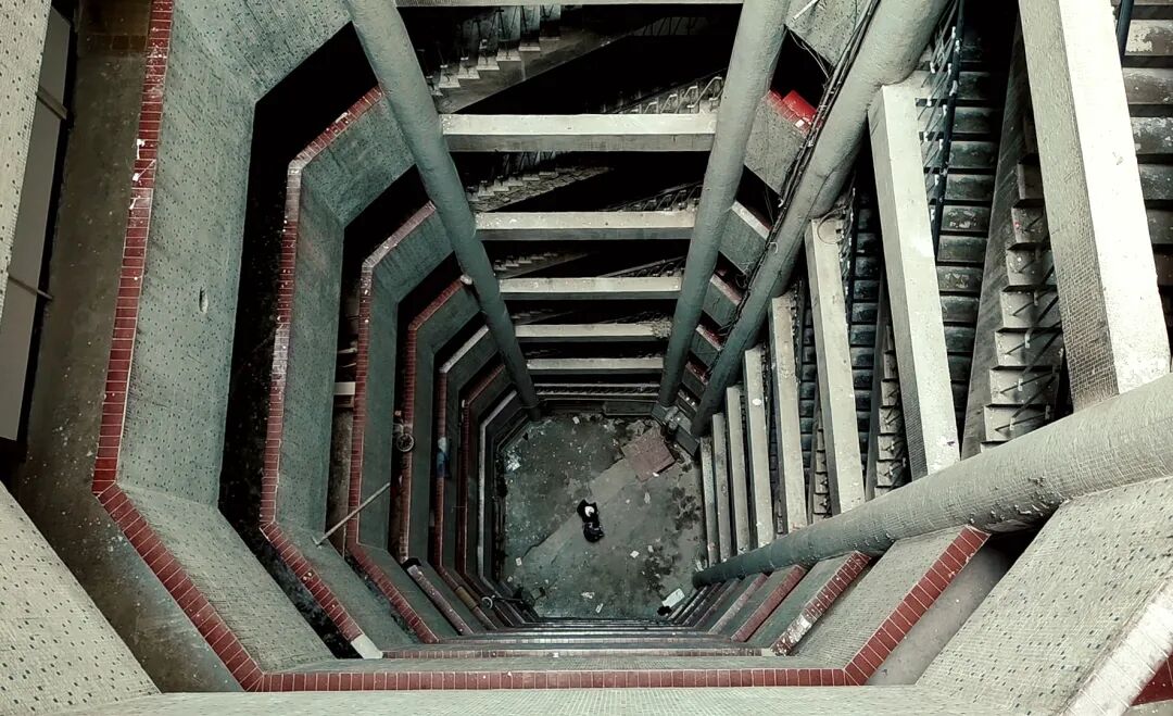 筒子楼的名称,来源于中间八角形的幽深天井。但即便在天气如此之好的今天,阳光也只能勾得着最高的三四层,再往下,便愈发地沉入昏暗,将人囚困其中。