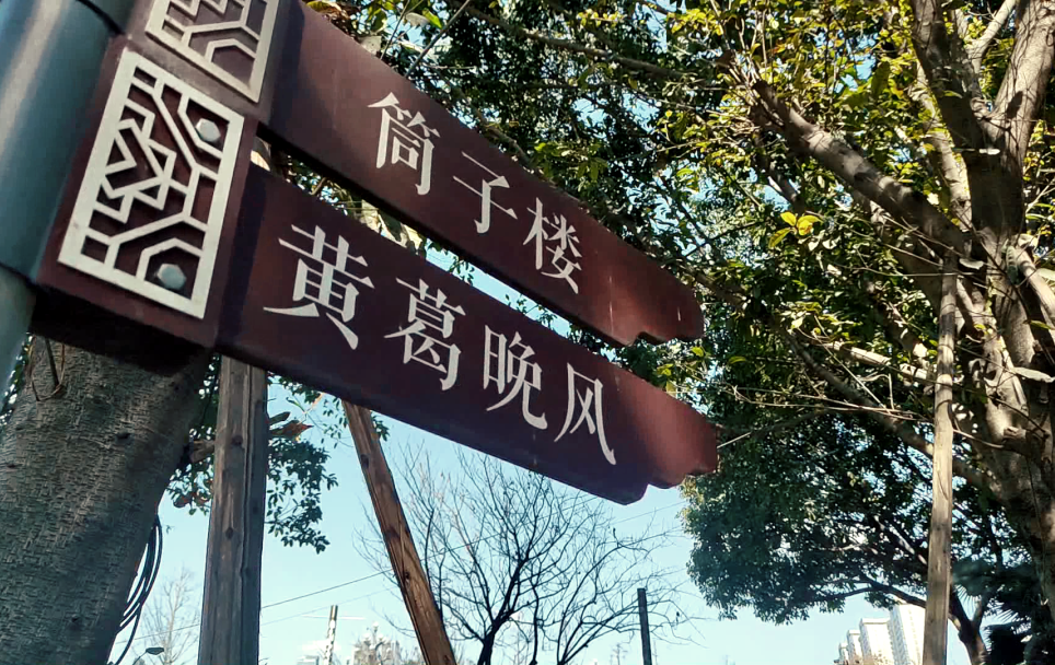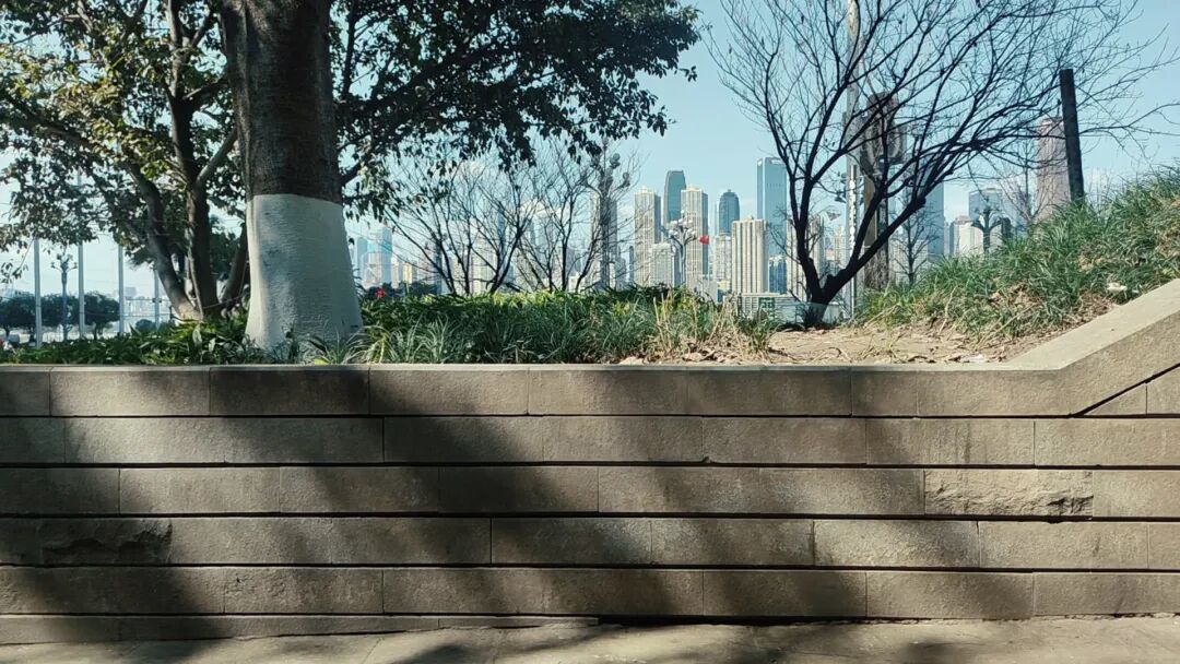 往前走,会看到一处石碑,底座写着海棠溪入口。石碑右侧的路标上,则清楚地标注出筒子楼的方向。登上台阶,远处渝中半岛的瓶瓶罐罐在晴朗的阳光下一览无余,俨然一副现代化大都市的模样。