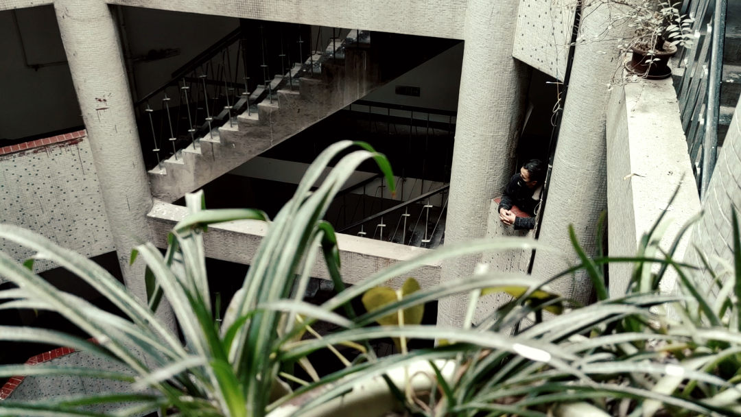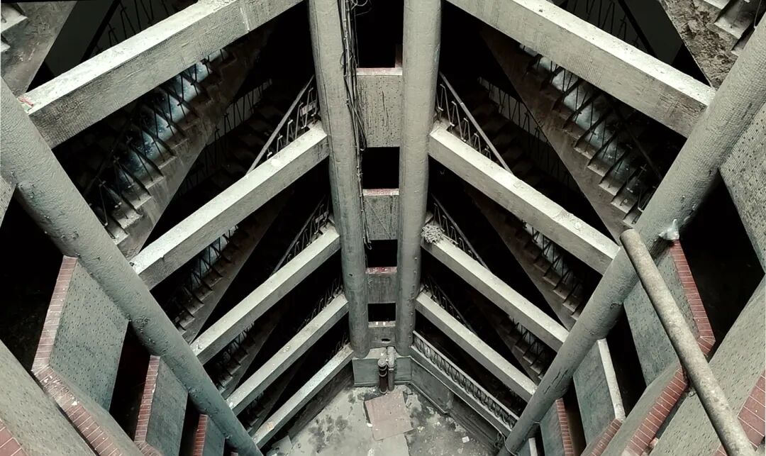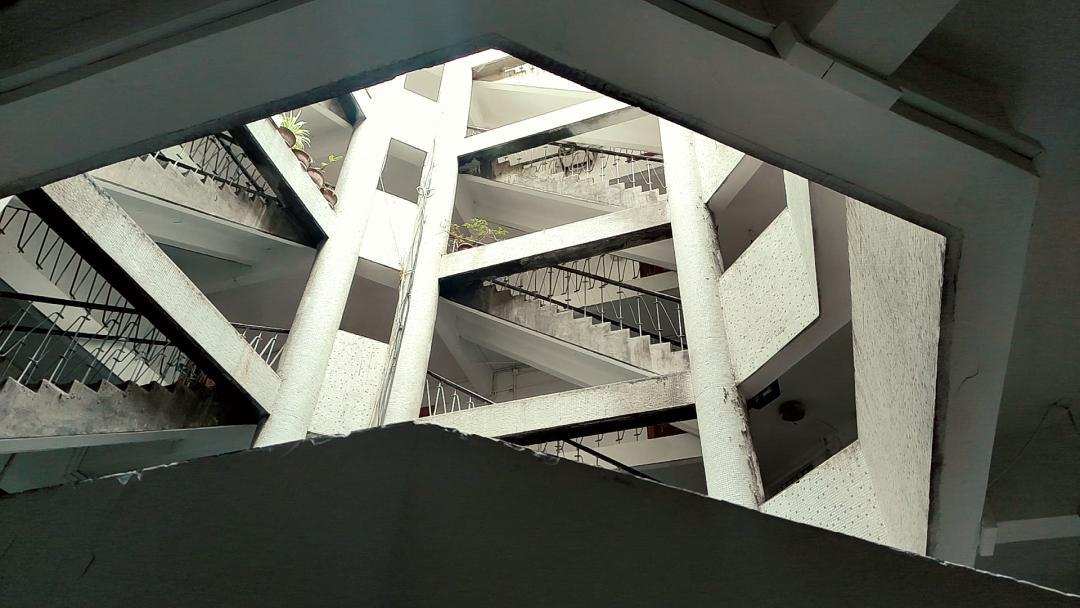 与当下惯用的楼梯形式不同,联系每层的单跑楼梯并不首尾相接,这极大地增加了流线距离,但却误打误撞地使得这个天井在形式上富有特色。斜向的梯段配合横向的拉结梁,构成了“Z”字形的线条符号。如果有人吹捧这里富有科幻感和现代感,那多少是和这个理由相关的。