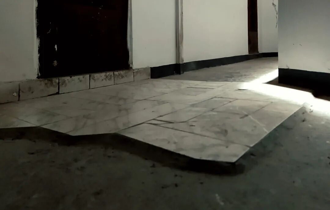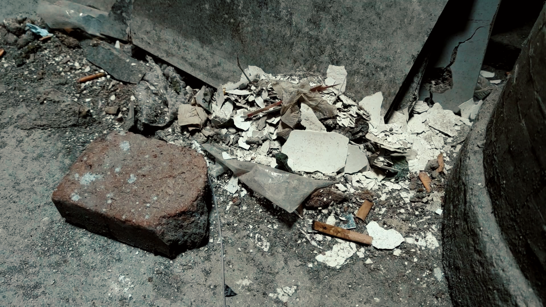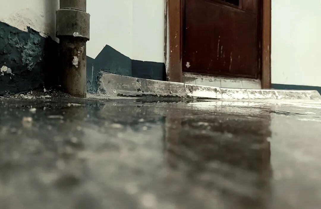 地面上残留着积水,暗示着水管已经破裂很久,以至于将墙脚的白漆都腐蚀脱落了;