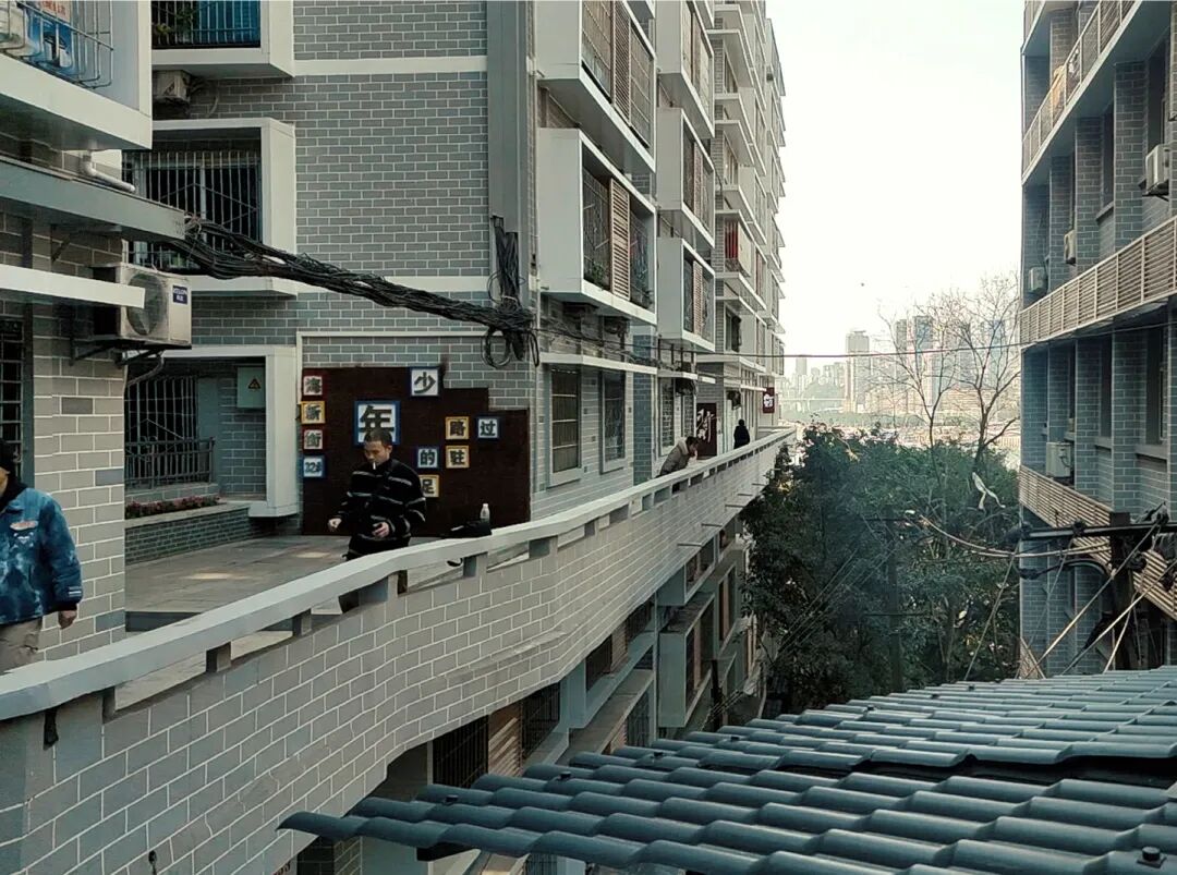 在走红以后,筒子楼似乎开展过一次修复和更新。外饰面的小青砖和木格栅显得颇为干净。电影《少年的你》的海报,张挂在建筑外侧的平台上。而朝右侧看去,则可以将整个渝中半岛的天际线纳入眼帘。