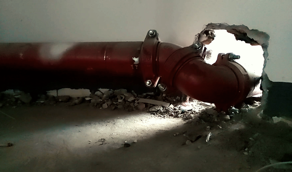 消防管道粗暴地穿过墙体,留下许多碎石;