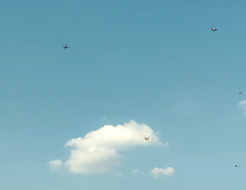 天空飘着许多风筝,愈飞愈高。一架飞机从中穿过,不知道要去往何处。