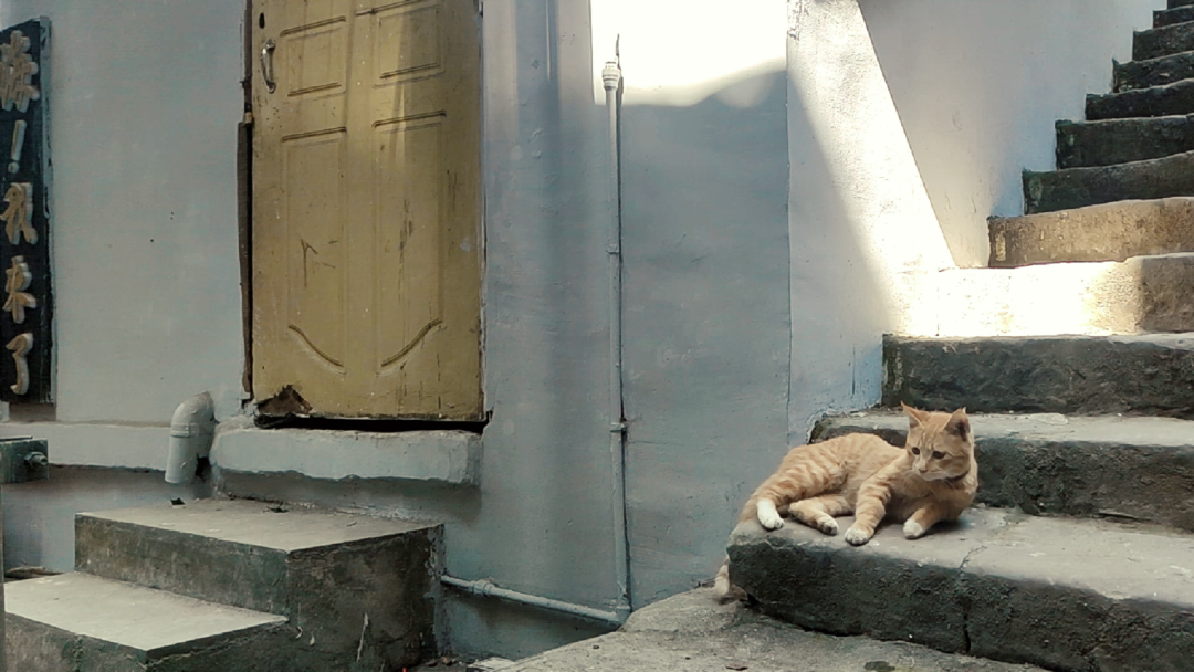 但这只是第一段台阶。继续往前,大约还需要再辛苦地攀登三段。街巷一旁是各色餐饮店和小饭馆。来往的行人相互打着招呼。且多以赞美天气为开头语。就连小猫也兴奋地凑了过来——虽然很快,它发觉还是躺着晒太阳更舒服。