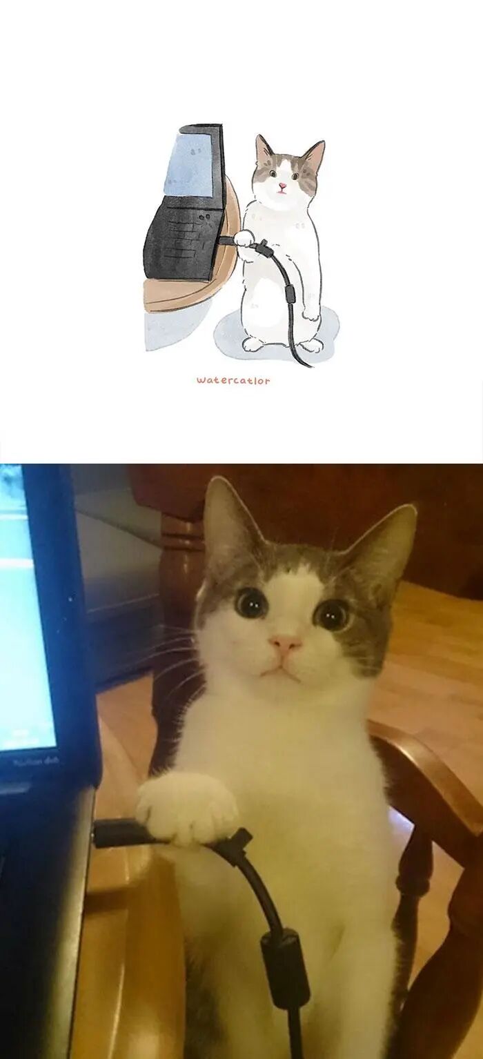 于是,在征得了猫主人的同意后,阿米莉亚·里斯基在海量的照片中,选择了一些非常有意思的,然后用水彩画的方式重新画出来,头戴卷心菜帽的猫,品尝红酒的猫,拔你网线的猫......这些本来就让人笑到飙泪的搞笑照片,被艺术家变成水彩画之后,搞笑程度似乎又增加了一分。
