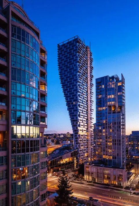 该项目位于加拿大温哥华,共60600㎡,这里是通往市中心的重要门户之地。由大桥和市区围合而成的三角形地块一直有待开发。我们先从解决限制条件入手:建筑需要与街道和桥保持一定距离,其中与桥的距离需要达到30米,以确保居住者不受车辆及行人的干扰;此外,设计还应确保邻近的公园不受建筑阴影的遮挡。