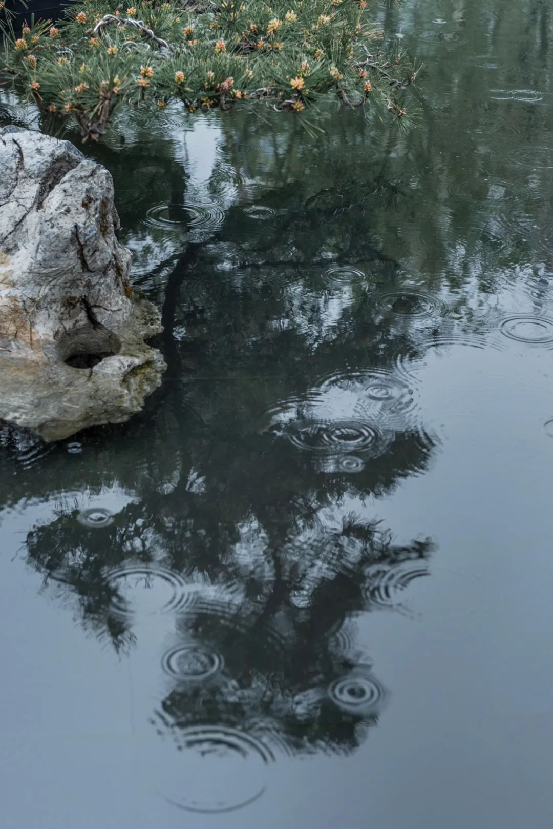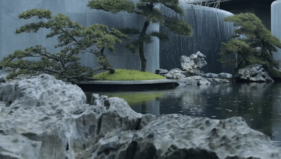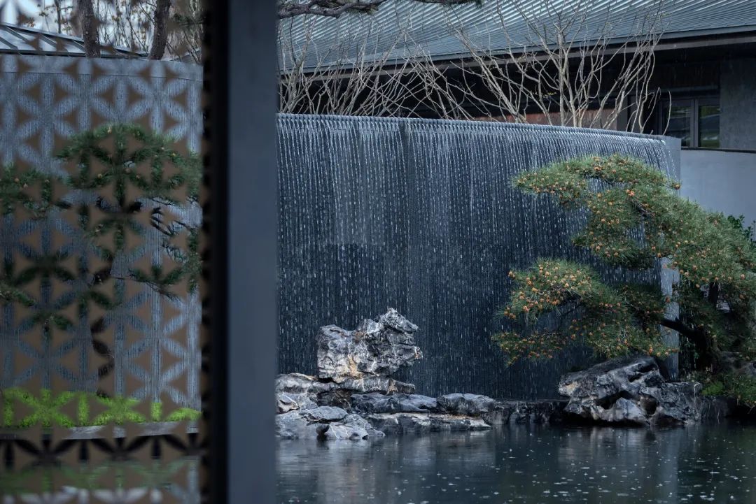 罗汉松清雅挺拔,枝干横展,展现出雄浑苍劲的傲人气势。高山流水,生生不息,飞泉之下,苍石抱松,象征着荣氏家风的百年传承。假山石、水流、青松相映成趣,构建出水院超然的山水意境。
