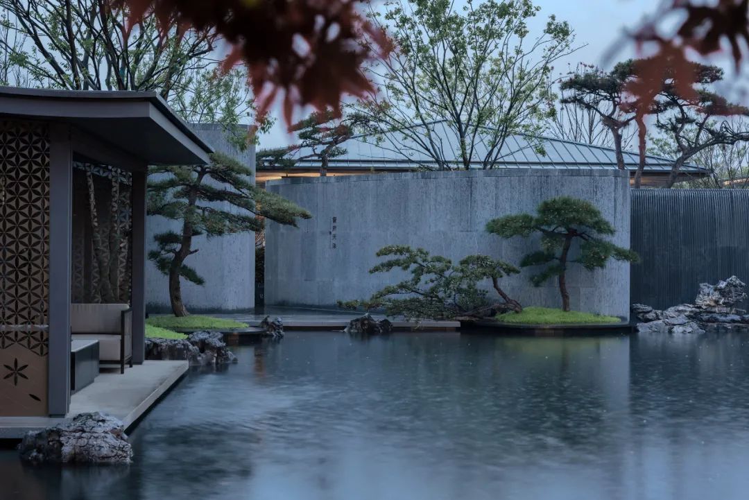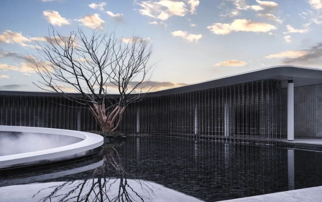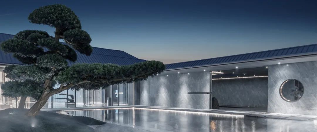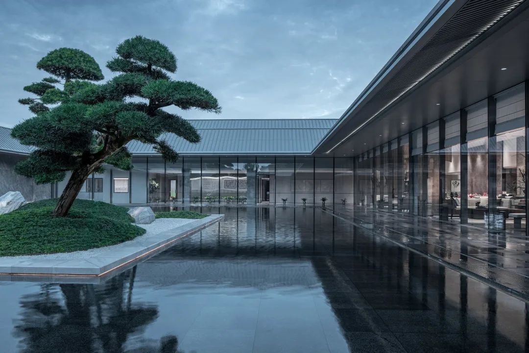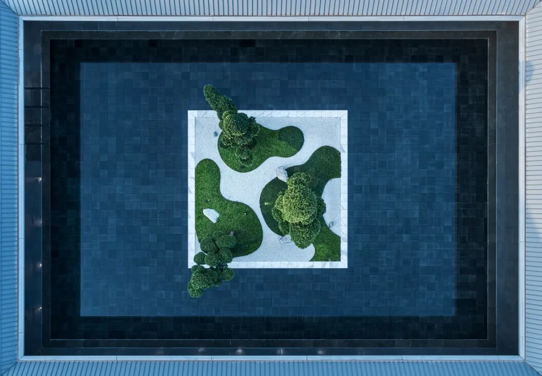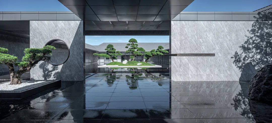 内院中心是三棵精心布置的松树组合而成的巨大盆景,白色石台作为盆景基底“漂浮”于水面之上。