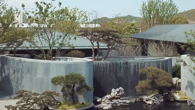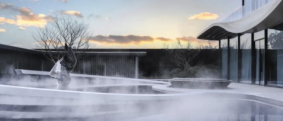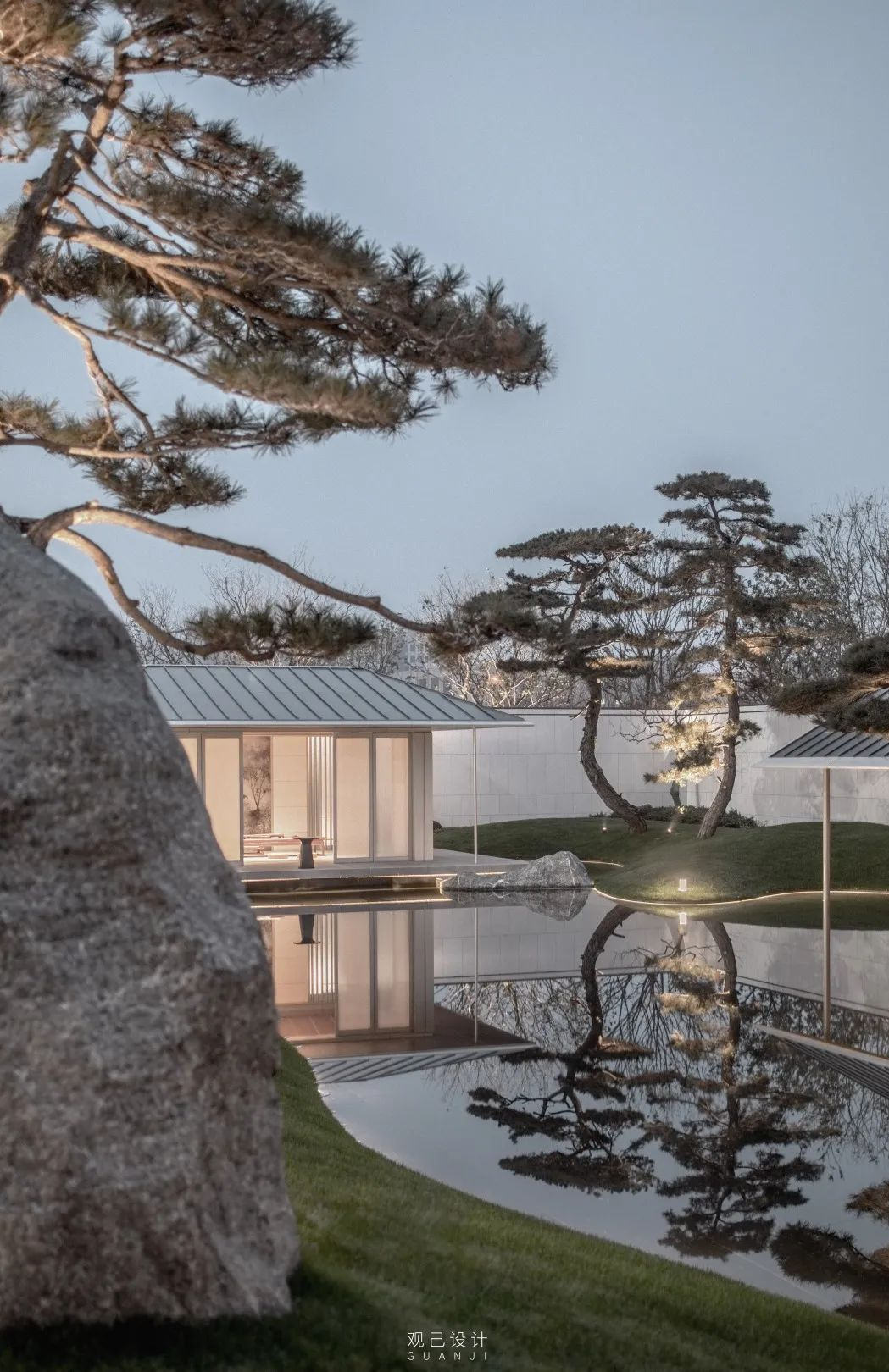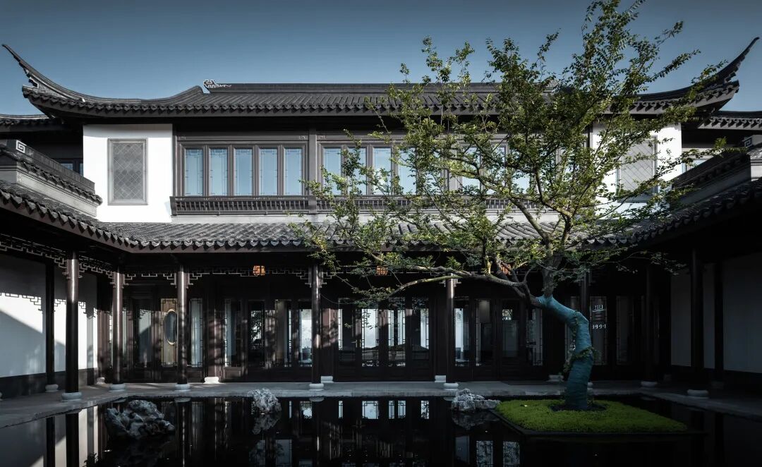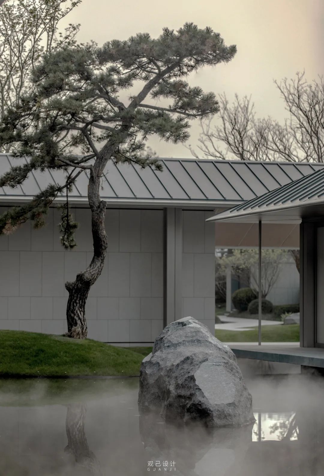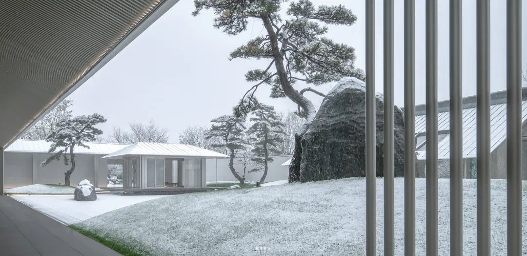 内院中心是三棵精心布置的松树组合而成的巨大盆景,白色石台作为盆景基底“漂浮”于水面之上。