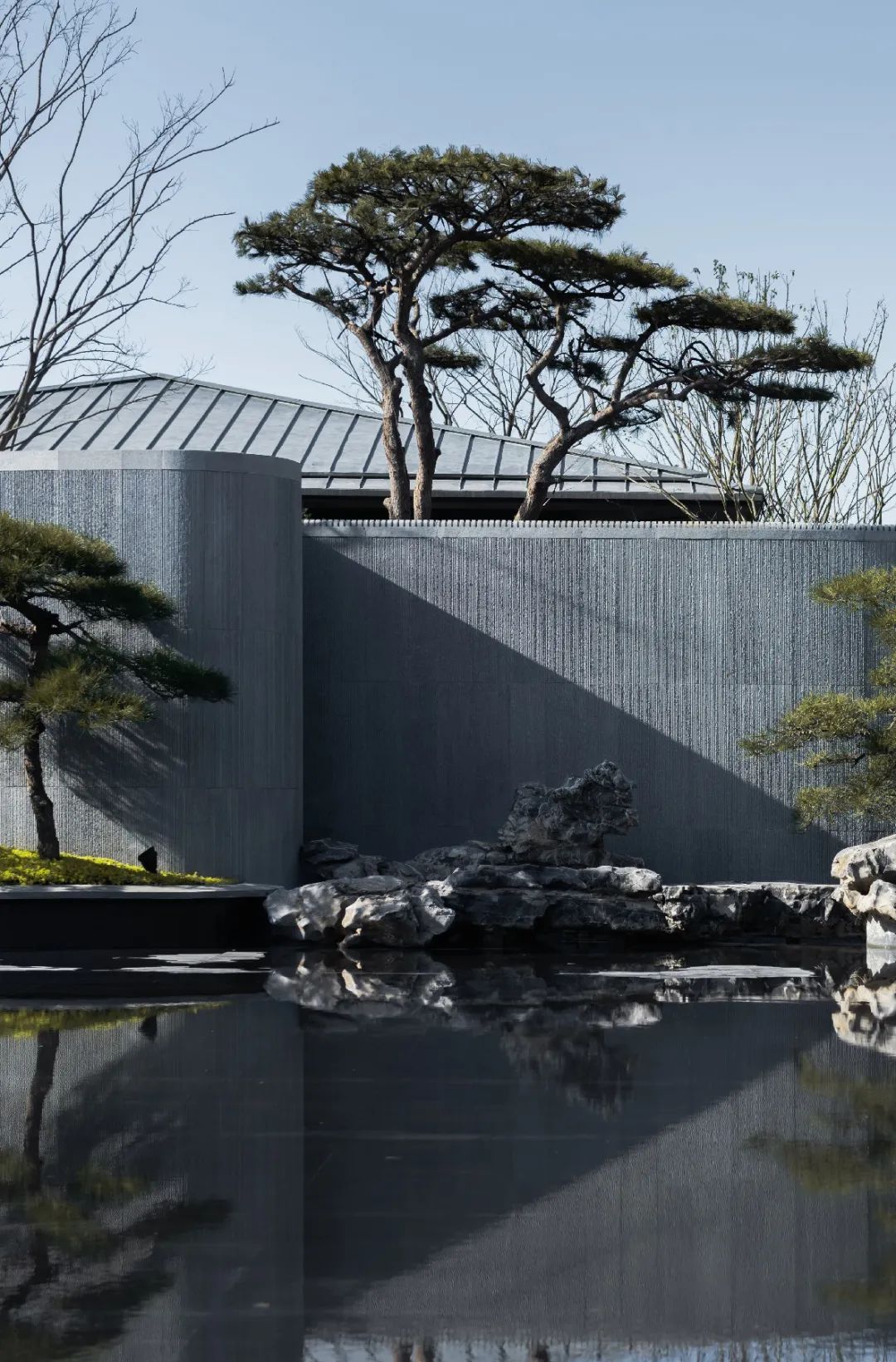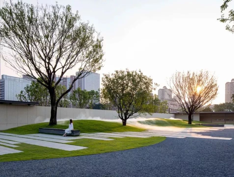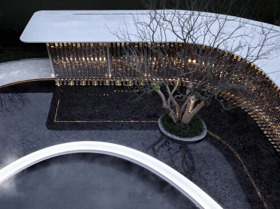 黑松与水。每一棵松树都独一无二,都有它自己的姿态与故事。苍劲的松树与中原文化的交融及对比,是通过现代设计手法将山水意境融入景观当中。