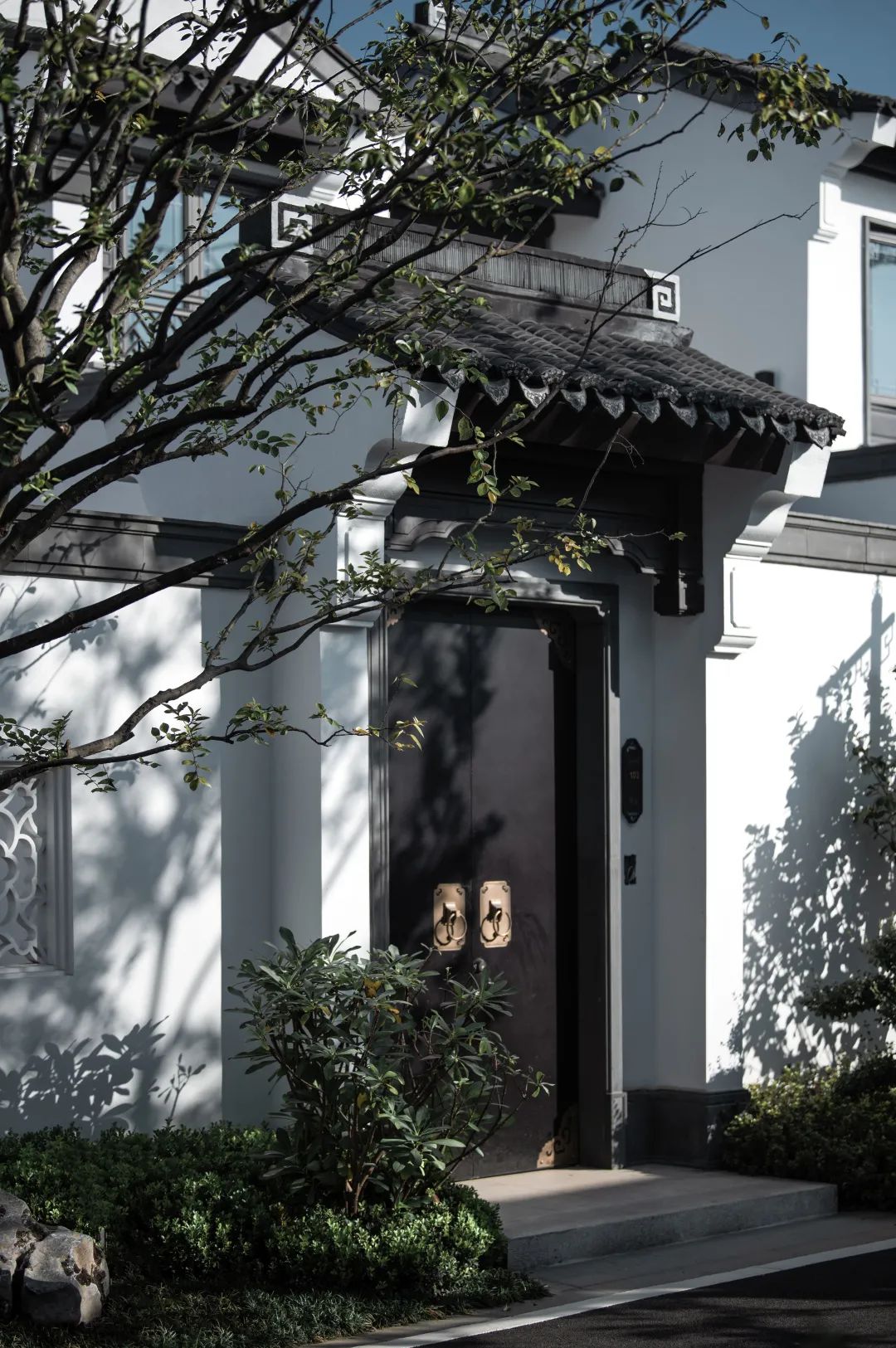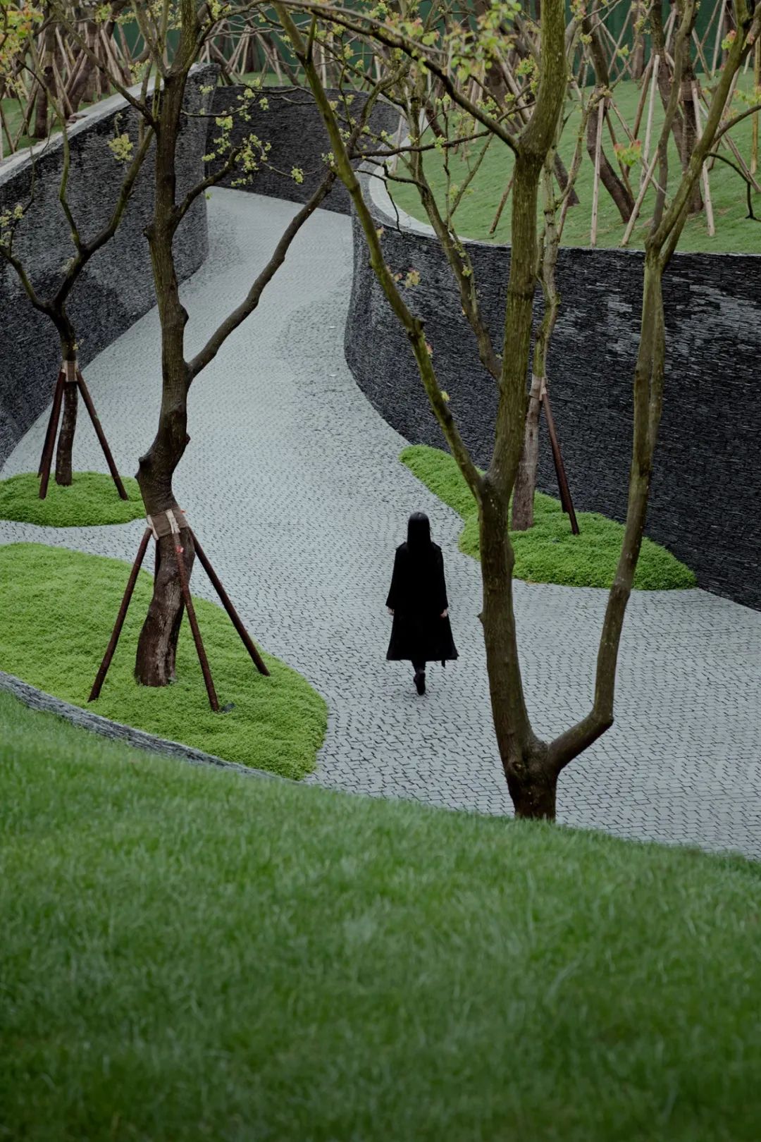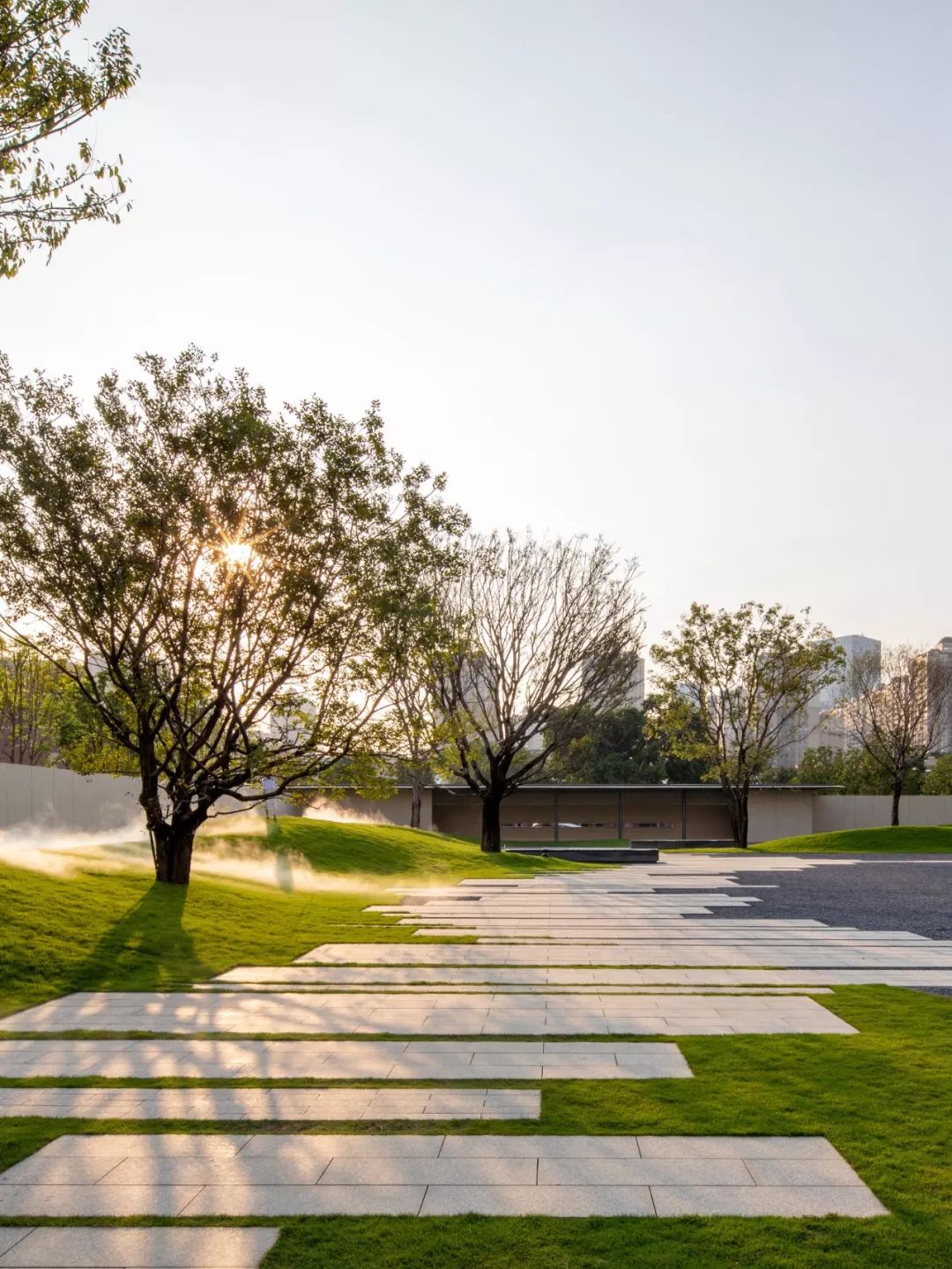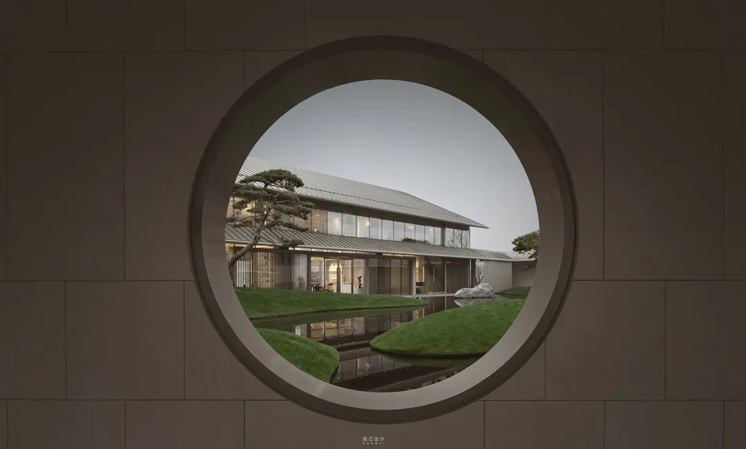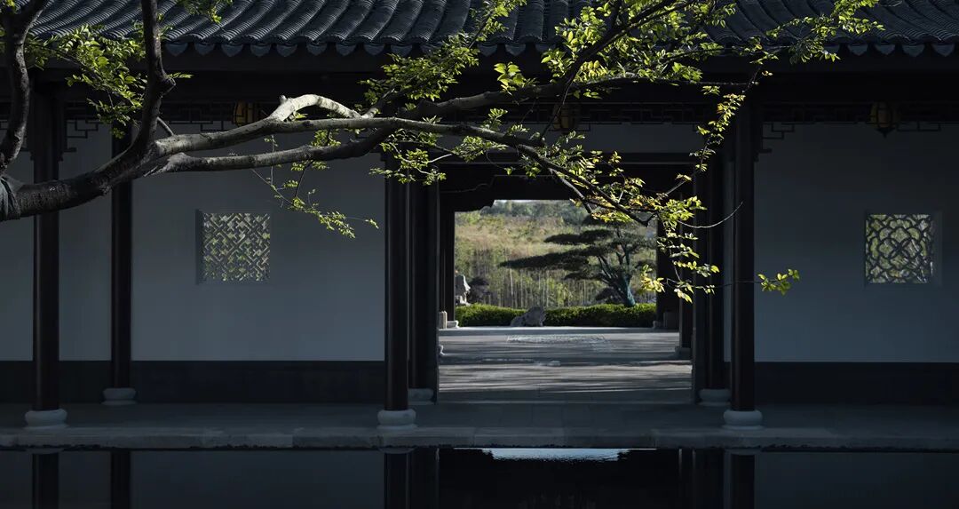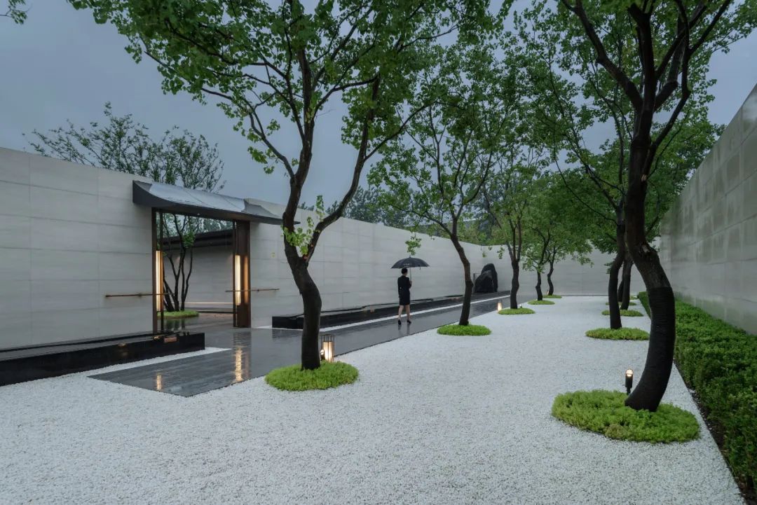 干净的墙面围合,如同丝帛一样展开,呈现出极强的开放性和视觉舒朗感。两侧的乌桕婀娜多姿,就像身形曼妙的侍者,以合适的距离,树荫交错,恬静而悠然。