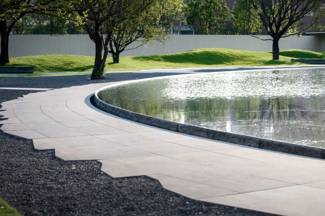 下沉庭院中,松柏与水影相互映照。种植池边缘以斜石与条石交相堆砌,材质的碰撞凸显品质。坐在水边小憩,赏松风竹影。