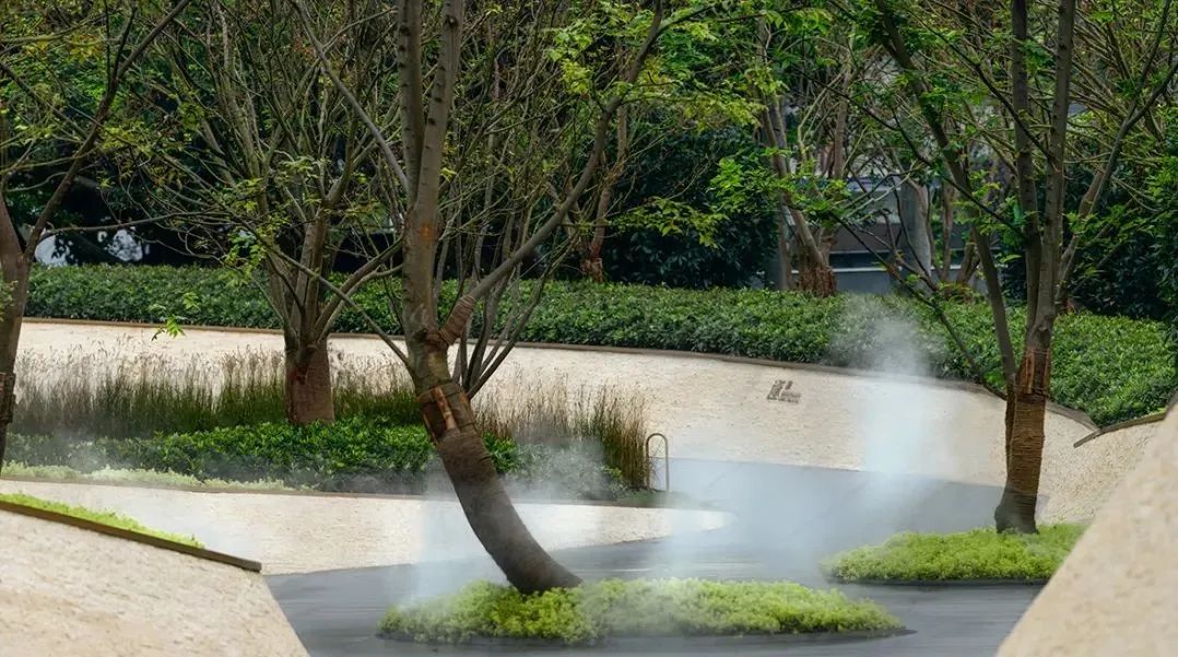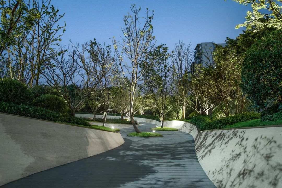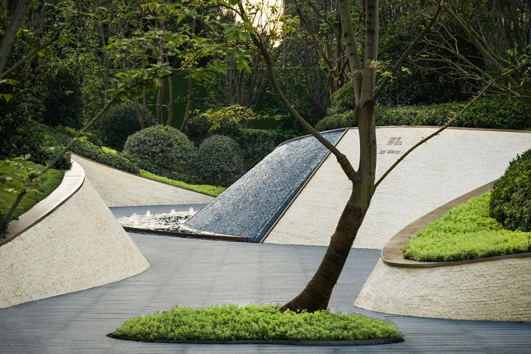 示范区场地通过双曲面景墙及微地形绿化的物理手法过滤原始复杂的城市界面,打造沉浸式体验。场地中心特选弯杆朴树与弧形景墙搭配,引导行人视线。