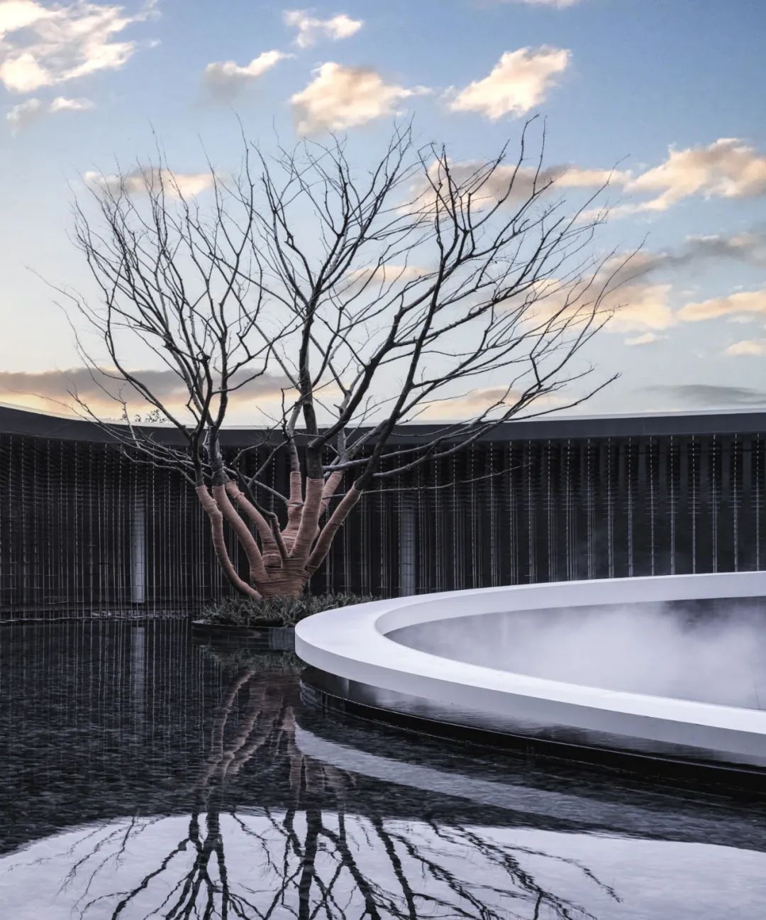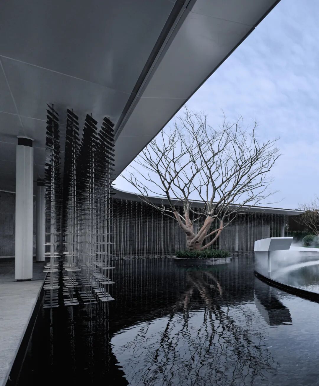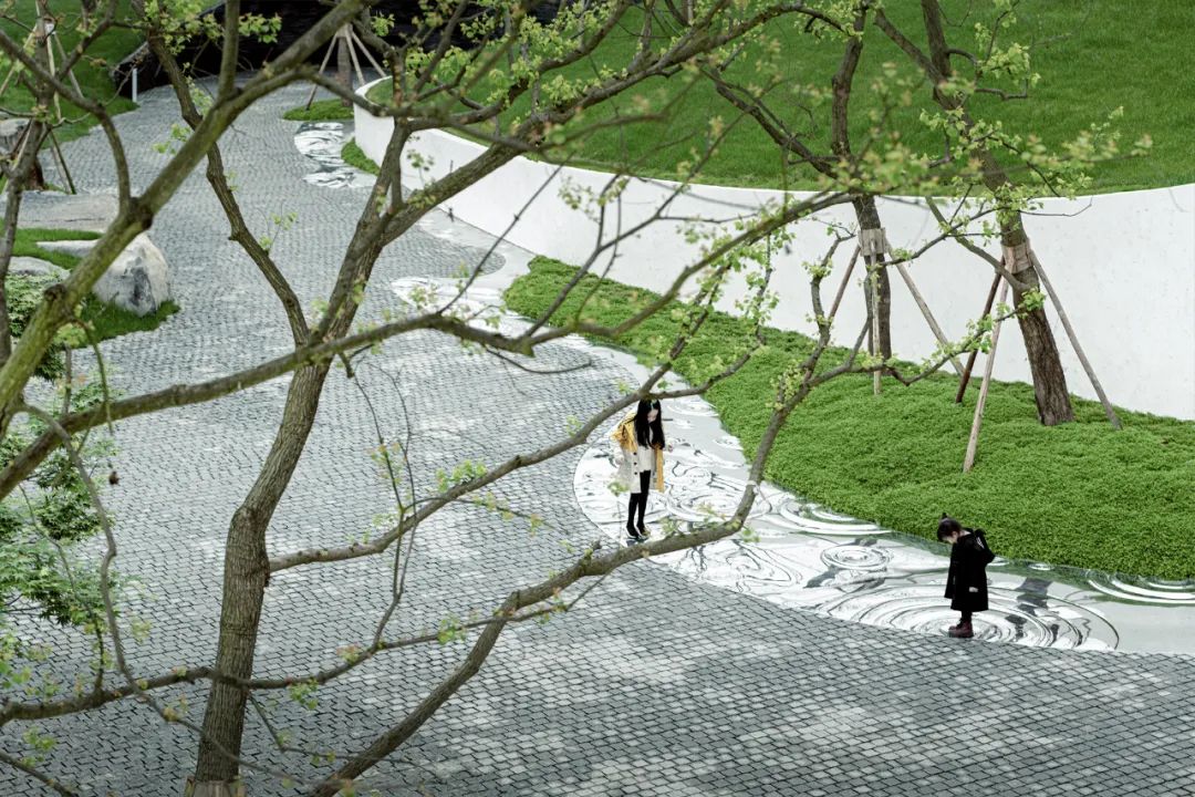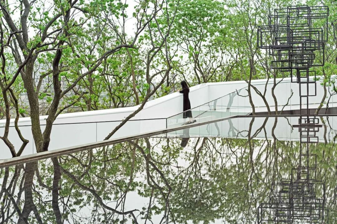 示范区的后场空间里没有一丝多余的色彩,朴树、装置、连廊、天空映衬在水中,艺术和生活不断交融,感受时间、空间带来的精神思考。