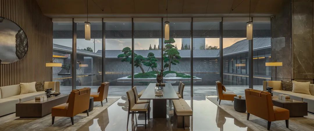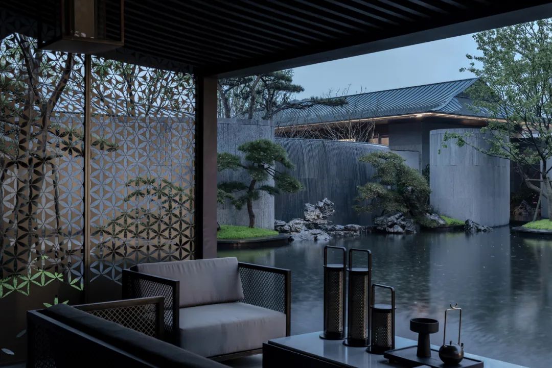 叠石水瀑,三棵青松,寥寥几笔,却可令游尘市嚣。门厅内以叠石水景,设计出主次入口两条动线交汇的空间,行进中自然感知水瀑与青松的友好与悦动。