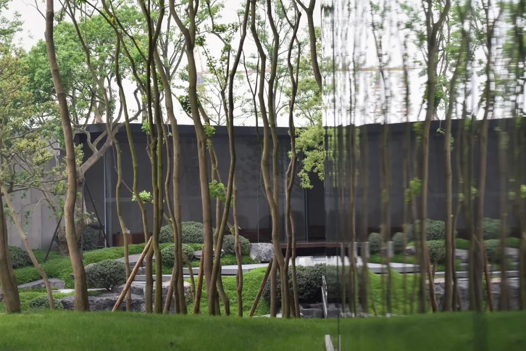 松树林的灵感来源于中国山水画之泰山之魂,也是从泰山脚下选植而来的。选松时,设计师数次跑到泰山、丈量每棵松树的尺寸及姿态,进行了数轮对比和推敲,最终找到了心中的那一片树林。