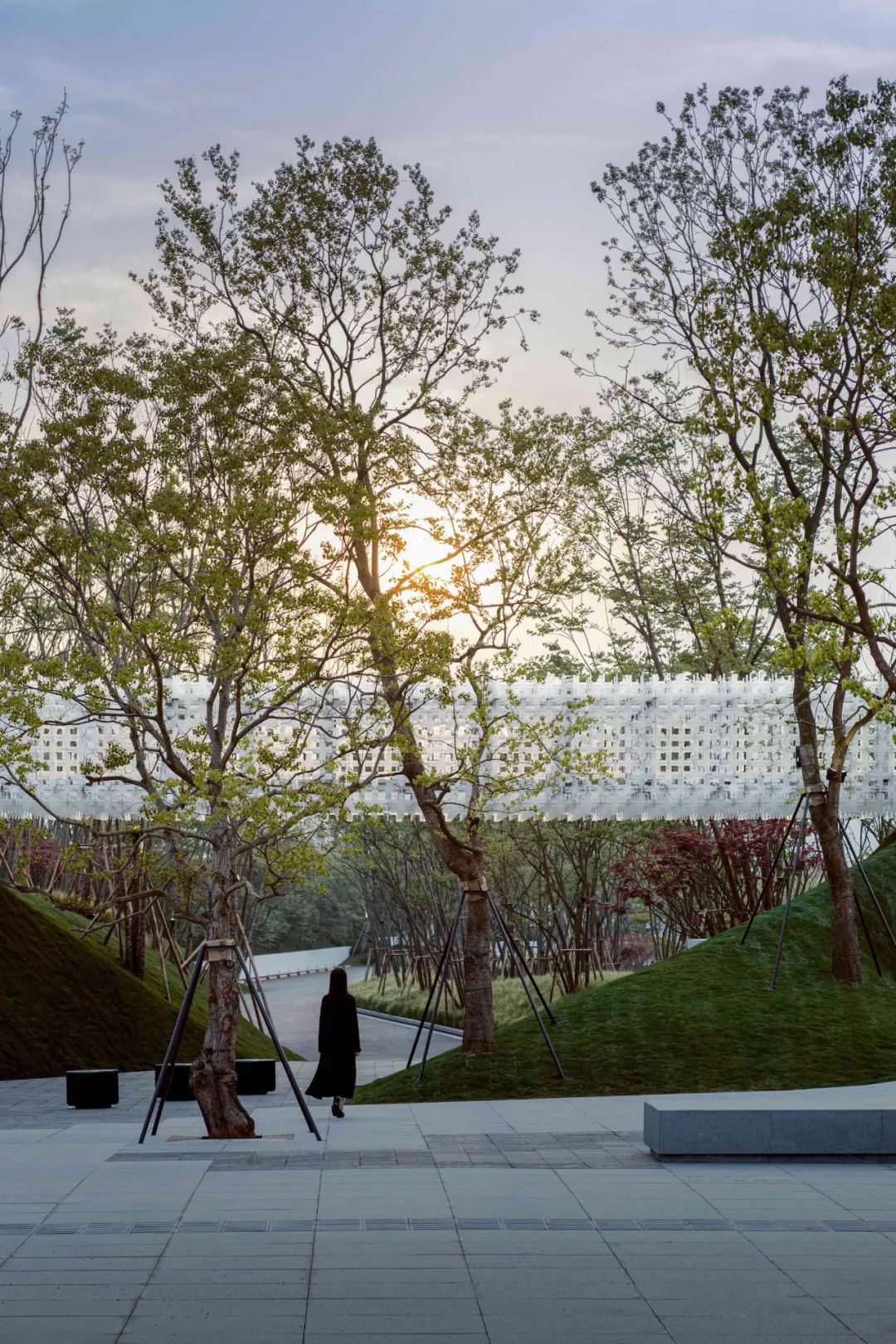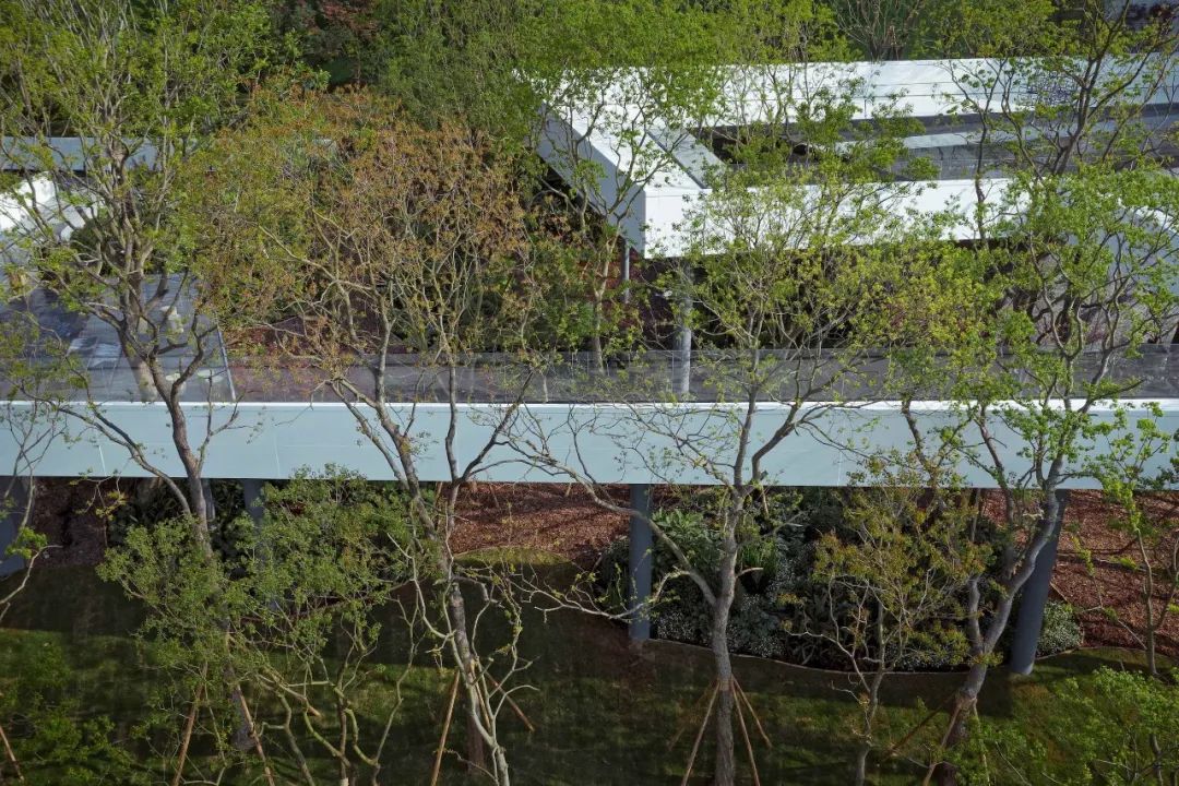斜飘、自由形态、具年代感……走访多个苗场,设计师精选中心广场的十二棵朴树,构建建筑与自然的直接对话,构筑对未来自然生活的向往。