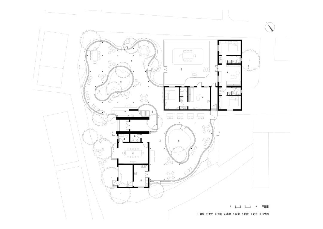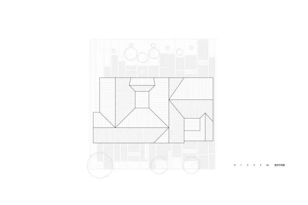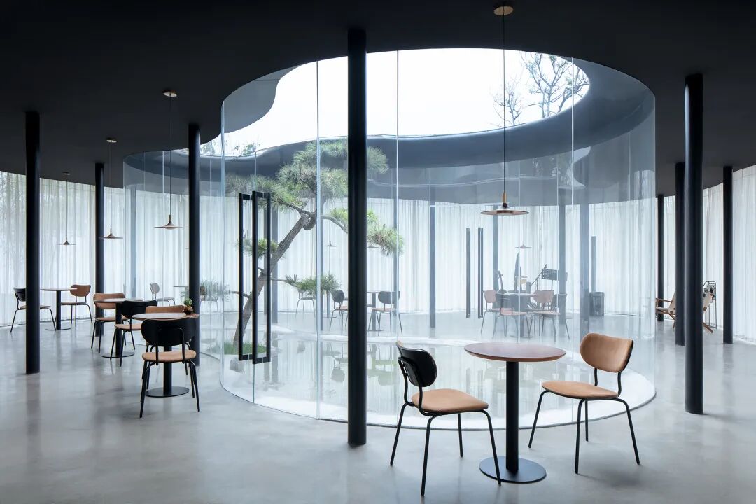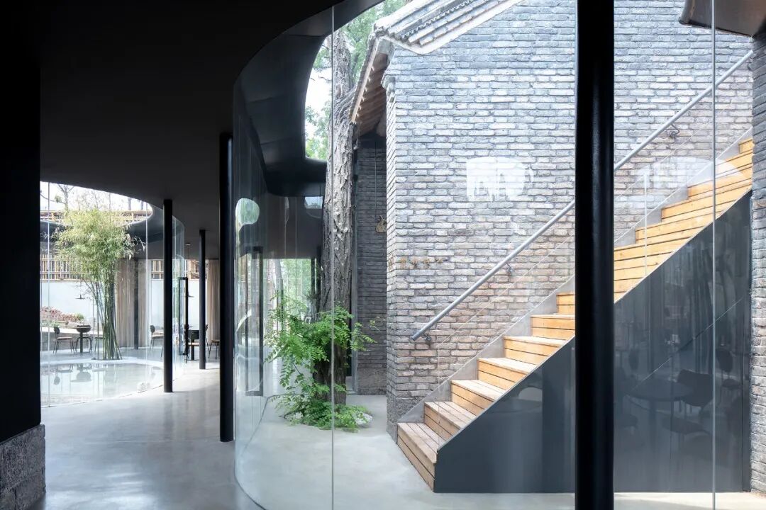 老屋内的十二棵古树也被完整地保存下来,曲线的玻璃边界和葫芦形的天井,都是为了绕开原有树木而产生的自然形态。通过运用弧形玻璃和素土建筑等设计元素,营造出「屋檐下」、「棚有台」、「土山房」等不同功能的错落空间。