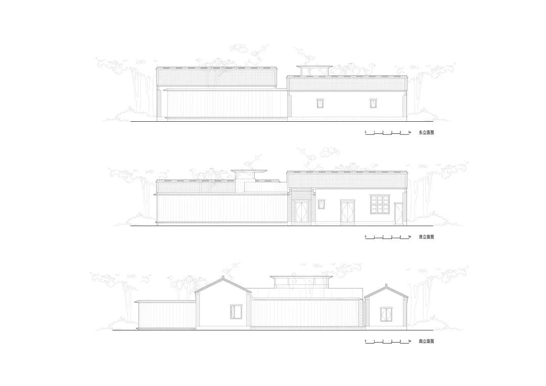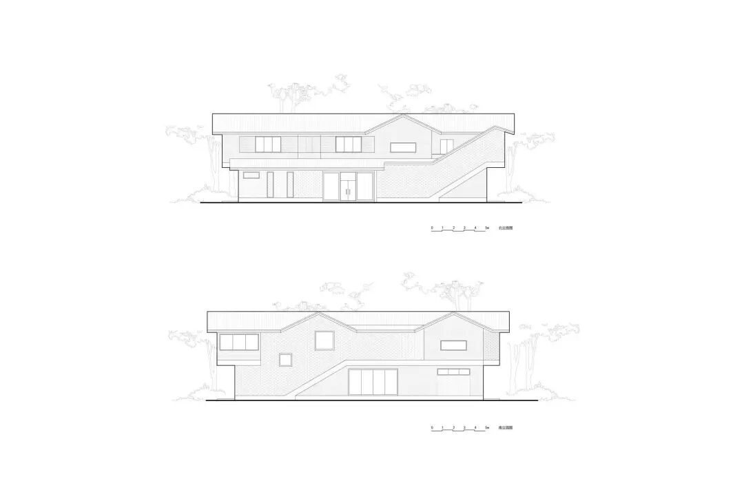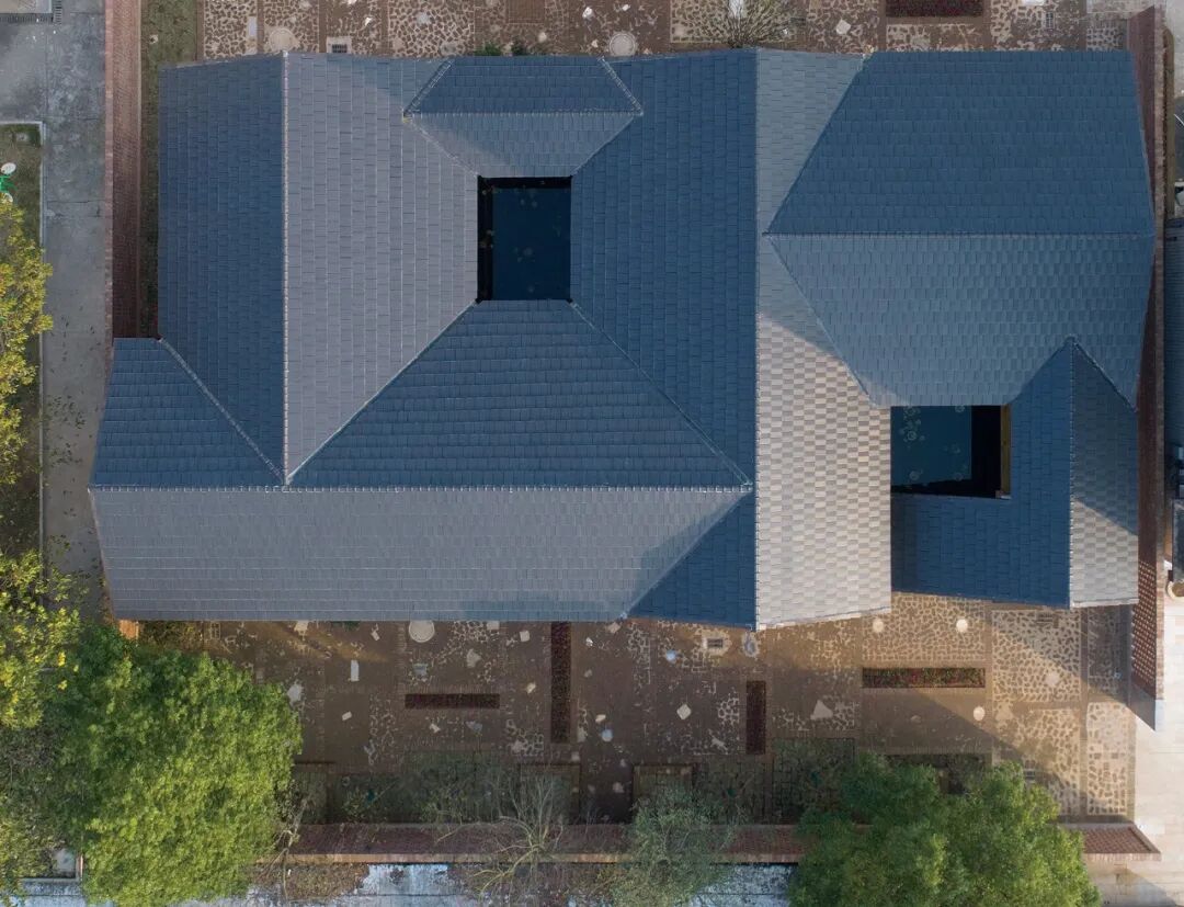 兼顾当代生活需求和乡土情感链接,建筑二楼嵌入“天井”和“四水归堂”的下沉式庭院景观,构造集水、纳阳、通风、采光等功能的场所微气候,俨然是“空中”两小院。一南一北两条走廊动线,与天井构成游廊,嵌入原居村落“上山”与“下山”的地形记忆。