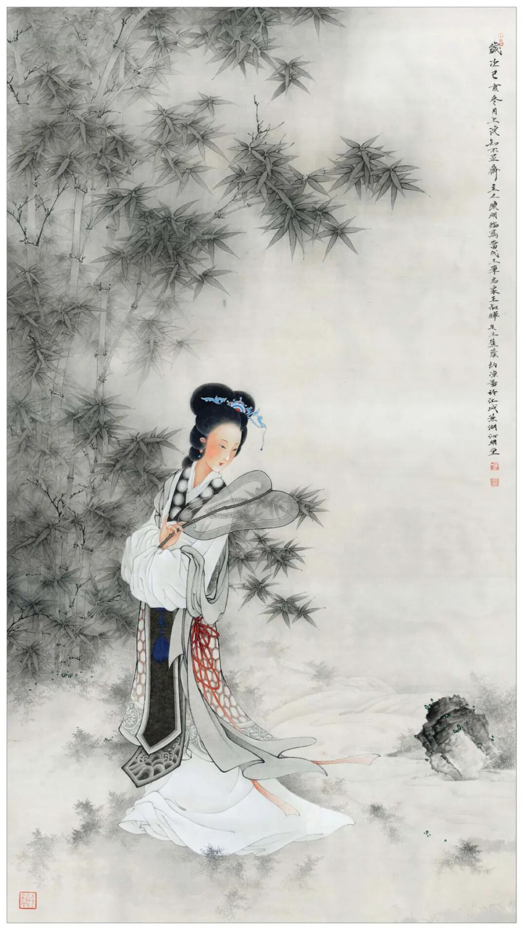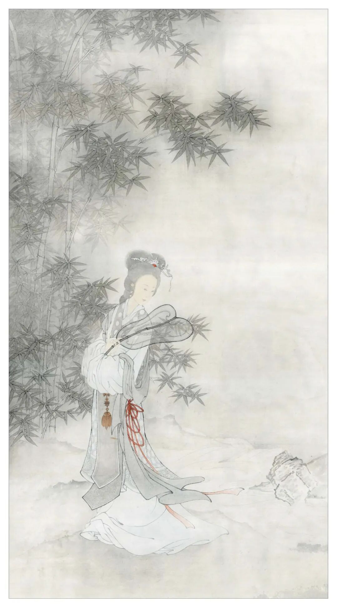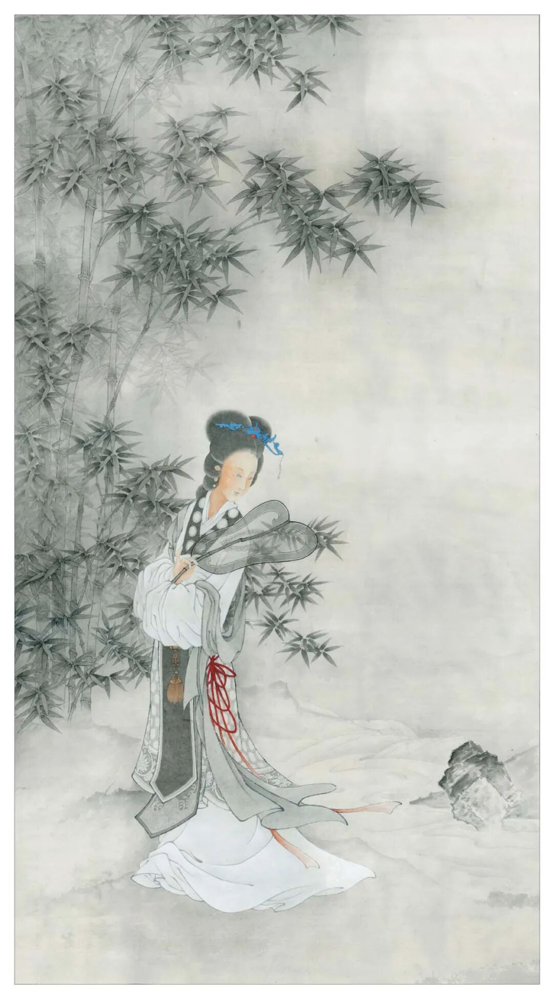 背景:先将纸张整体通刷一两遍中灰色(墨加白粉加大量水)。然后,将画面上竹叶集中的部位大面积烘染淡墨,叶片越集中,烘染的淡墨面积就要越大。接着,将人物下方的白色衬裙的附近地面也用淡墨大面积烘染。右下溪流流水上方的空白处也需要简单烘染。