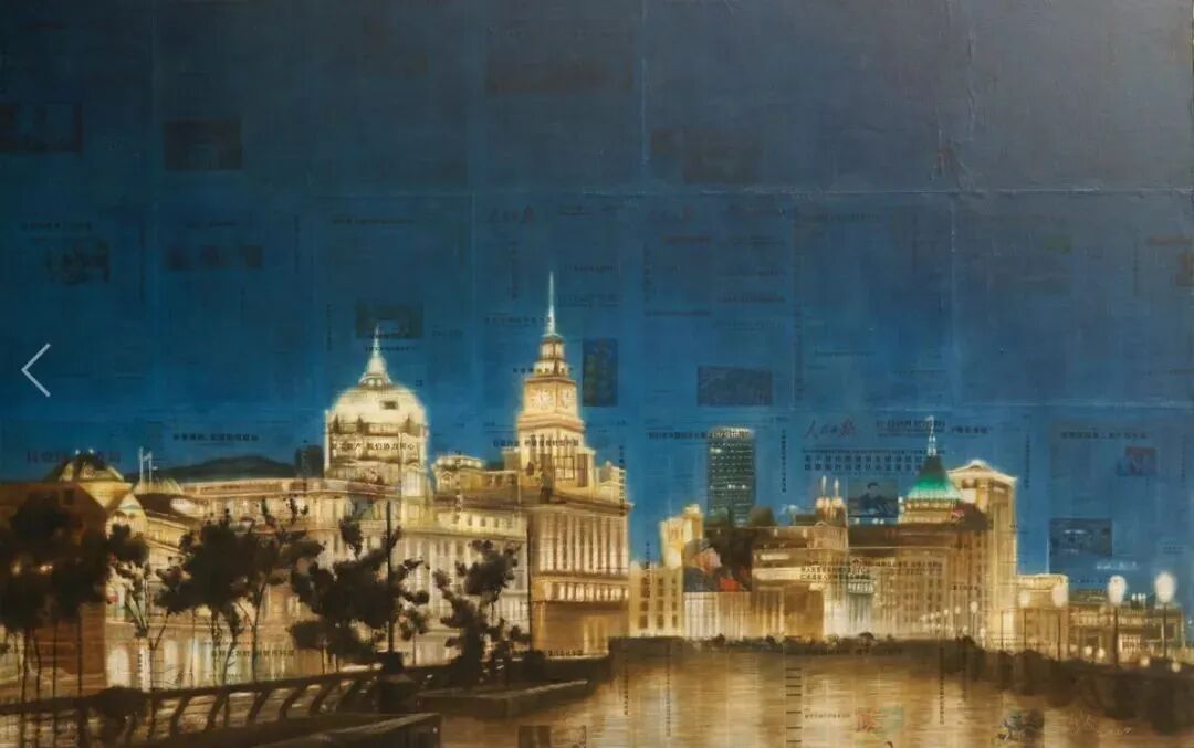 展厅中最大尺幅的作品是《20200226外滩》 ,艺术家将外滩的景象置于早已处理好的报纸之上,报纸的内容也与上海外滩存在着某种意义上的直接关联,这既突出了事件的真实性,又强调了描绘对象的艺术性。整个后背景是冷冷的偏蓝色,而前景是暖暖的金黄色,既尊重了作品描绘对象的傍晚时间,又带有某种生活中的象征意义。这种冷暖的对比,以及蓝色和黄色的运用,给画面带来一种神秘感。