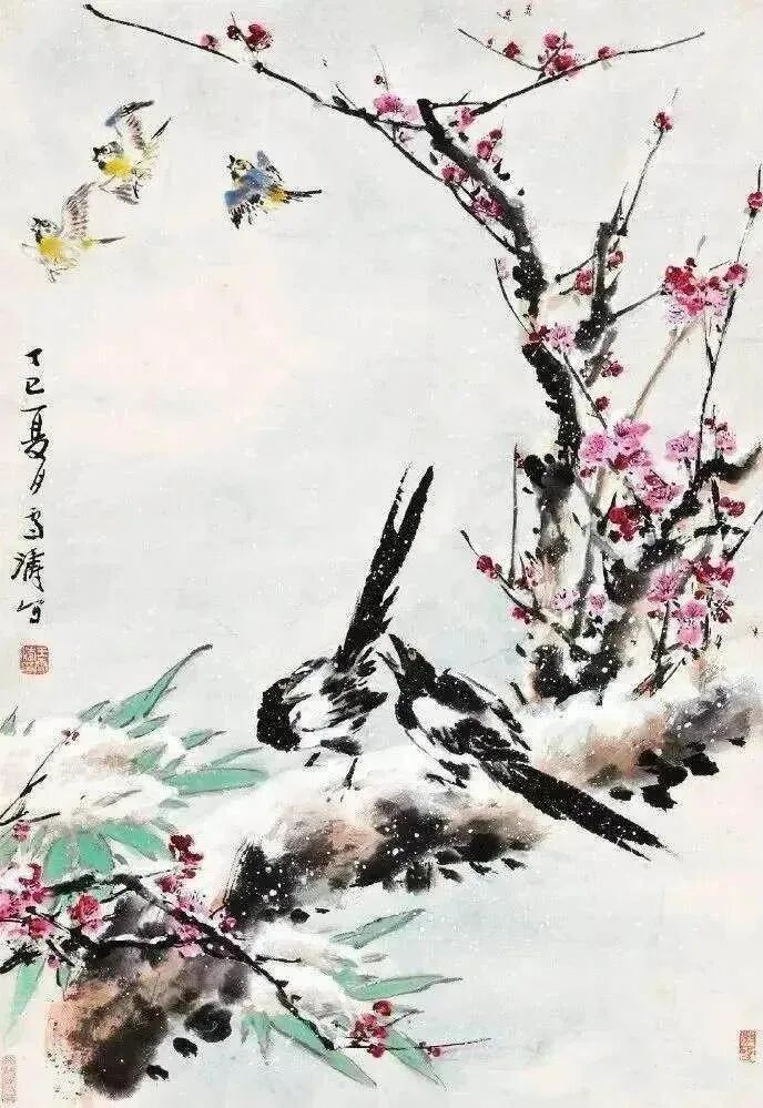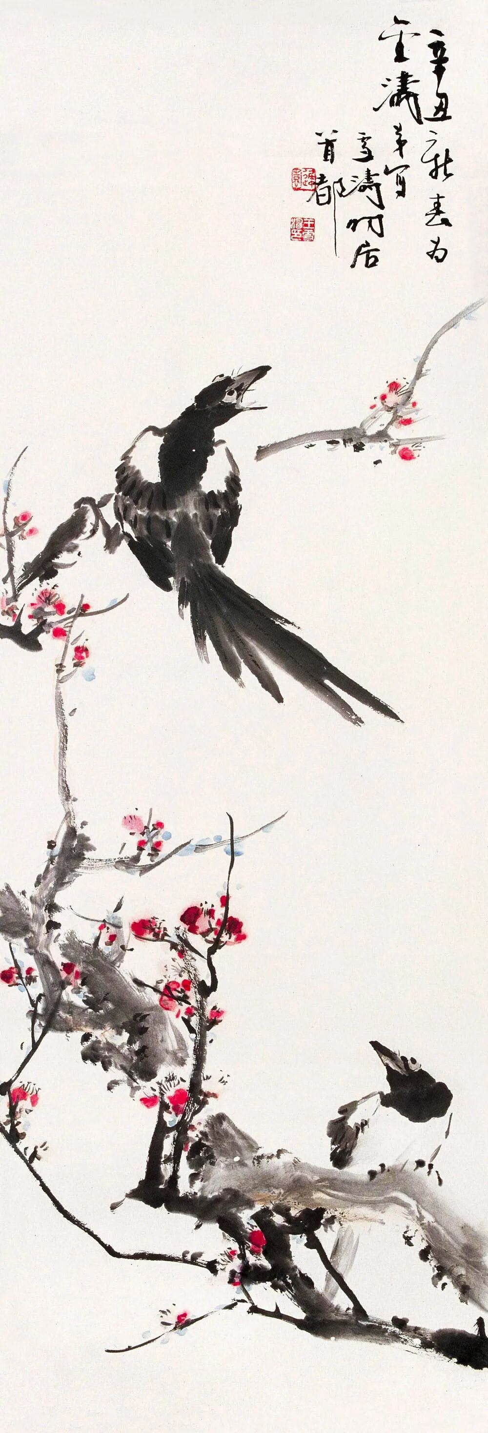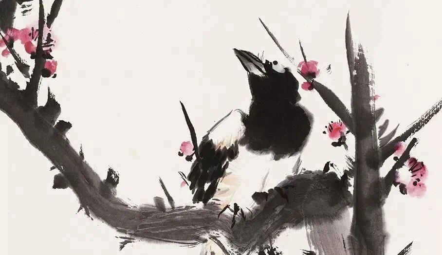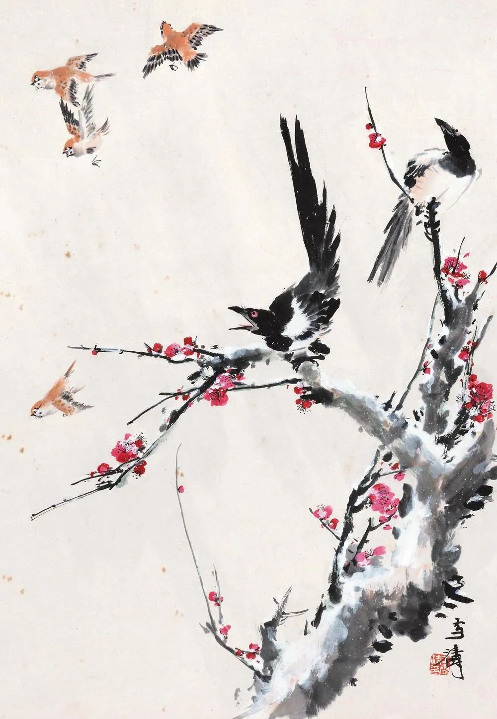 王雪涛先生以高度概括、爽利果决的笔墨写梅枝,劲挺老辣;点点红梅,绚烂至极;喜鹊笔笔生发,灵动活泼,跃然而出,既符合了时代特色又令纸面文气不减前人,真是令人连连称绝。