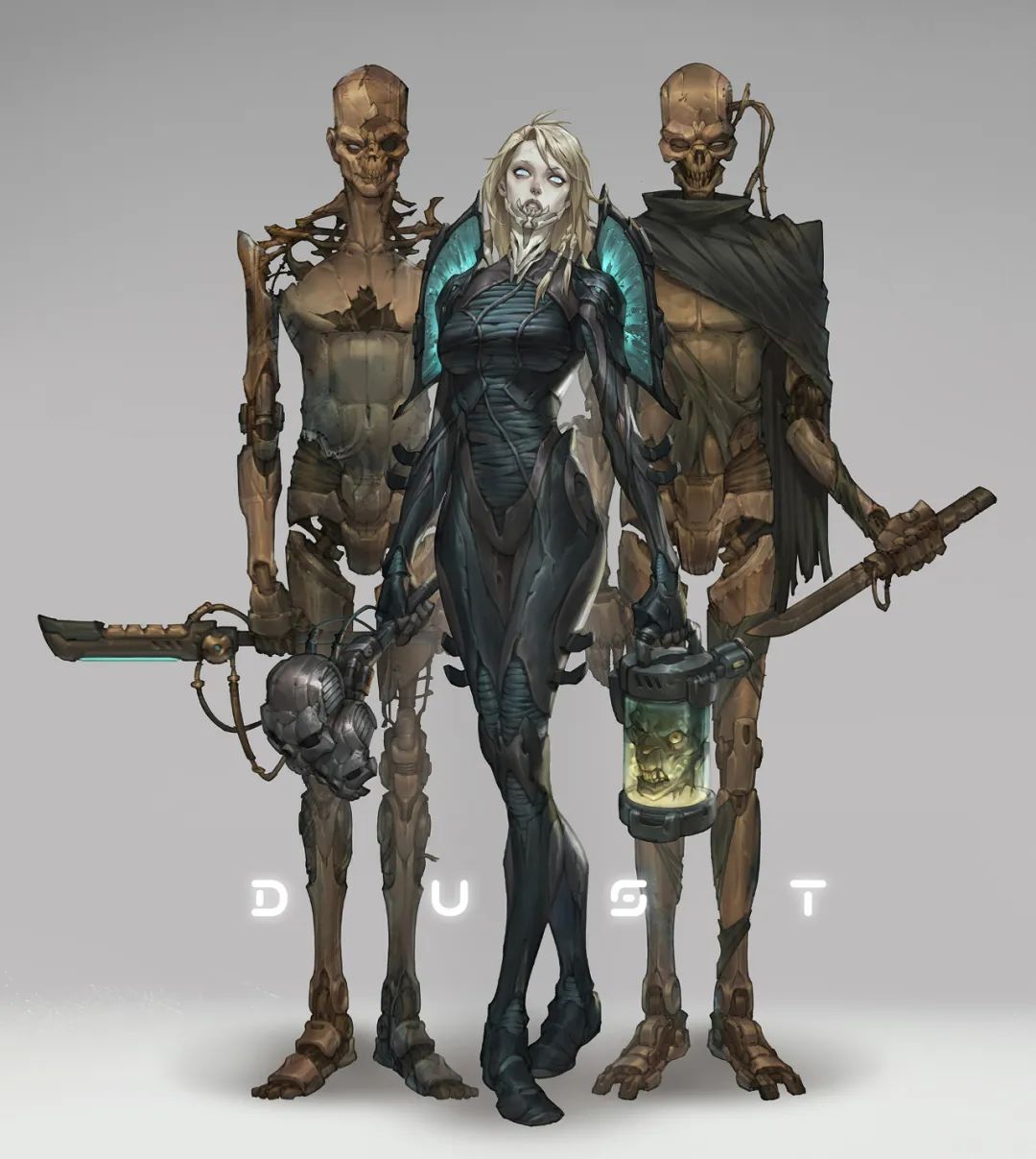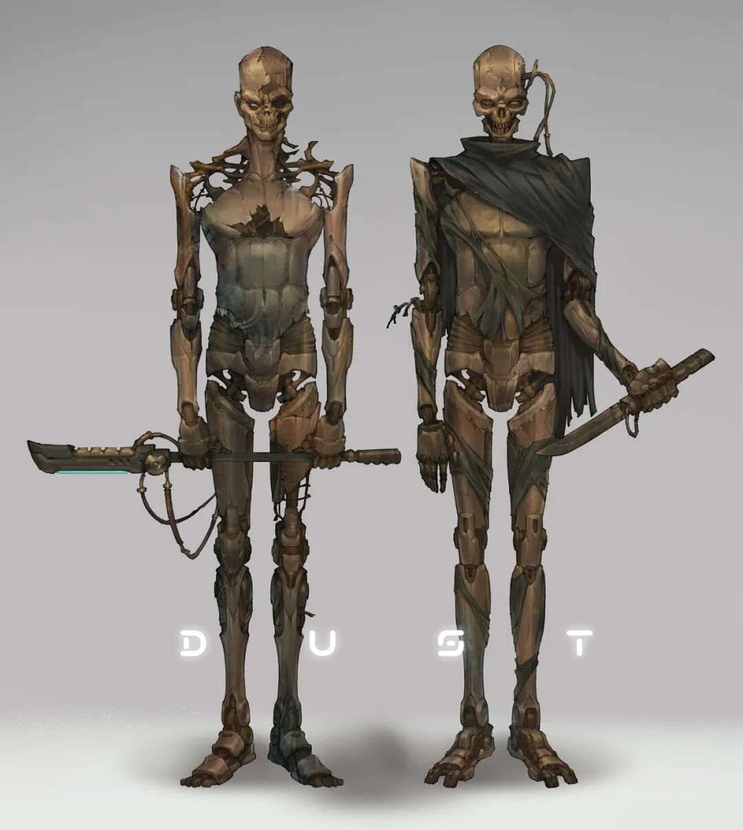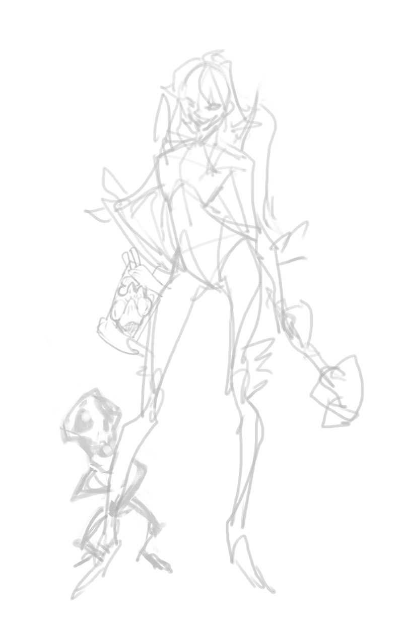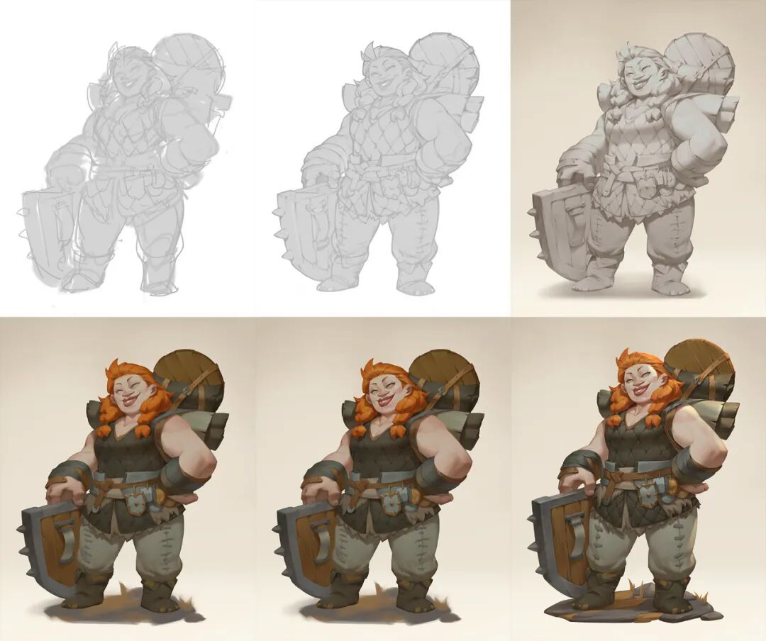 其次由于新人阶段基础能力有限,越深入刻画反而会越破坏原有的大感觉。线稿的完整可以帮助我们更好的解释设计信息,所以我给出的建议是做简单体积处理的留线创作,然后慢慢过渡到半去线(留外轮廓线,去内结构线),时间久一些积累一点经验后再尝试全去线的深入细节刻画。任何一张图我都不会“慢慢磨”,因为磨是在放弃思考,使用一些无意义的反复涂改毁掉一张画。