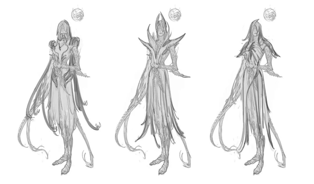 其次由于新人阶段基础能力有限,越深入刻画反而会越破坏原有的大感觉。线稿的完整可以帮助我们更好的解释设计信息,所以我给出的建议是做简单体积处理的留线创作,然后慢慢过渡到半去线(留外轮廓线,去内结构线),时间久一些积累一点经验后再尝试全去线的深入细节刻画。任何一张图我都不会“慢慢磨”,因为磨是在放弃思考,使用一些无意义的反复涂改毁掉一张画。