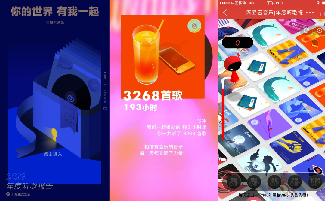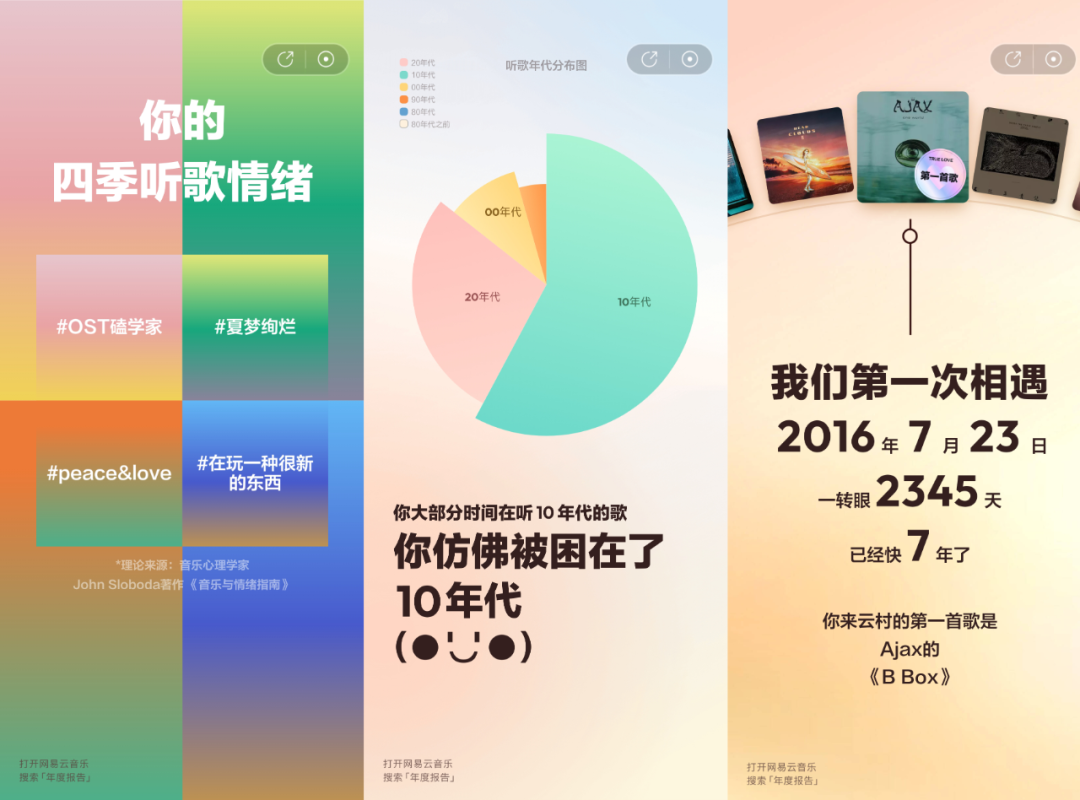干货2024-01-30 网易云音乐年度账单又一次霸占了我的朋友圈! 伴随元旦的脚步越来越近,各大APP都推送了自己的年度账单,但每一年网易云的年度账单总能刷爆朋友圈,晒网易云音乐的年度账单成为了“生活仪式”,网易云音乐是如何做到每一年的年度账单都可以霸占用户的朋友圈? 让我们从产品和设计角度出发,探索一下网易云音乐的流量密码是什么,如何能做好一份年终总结H5? 产品层面 用户的黏性和忠诚度不是因为年度账单建立的,而是靠产品的日常化沟通和阵地化经营打造的。 相比其他的音乐播放产品,在拼资源和版权。网易云音乐走的则是音乐社区路线,网易云音乐以歌单、乐评、动态等为特色,加上关注明星、达人和好友等功能,将单向的音乐传播转化为双向的交流分享,打造了音乐社区,这样引起用户的兴趣共鸣,提高用户使用黏性和忠诚度。这一点就使得网易云音乐避开了内容平台流量板结在头部,腰部和底层真空导致生态不活跃的常规困境。 “社区”的形成本身就意味着有大量拥有共同目标或兴趣的用户聚集于同一平台。而当用户达到一定规模之后,又会自动分化至多个细分垂直领域,再通过分享和交流不断产出内容,加强更细颗粒度的群体之间的链接,以此增强整个群体的认同感和归属感。 文案设计 网易云的文案是研究过用户的心理的,2022年的网易云年度账单开篇第一句话就很懂我,这一年给我们带来的感受是不美好的,最近更是各种恐慌和焦虑,这一句触动了用户的心。 最后的标签部分的用词回归到正能量与希望,通过百分比让每一个人的微标签更细分化,所以说网易云音乐在用心的理解用户的心情,而不是让用户去理解产品。 设计层面 网易云音乐的年度总结H5的整体视觉风格是具有延续性的,每一年H5的画风保持着轻松的风格,没有繁杂的氛围营造,画面更多的是留白,搭配着文字排版,不会给用户视觉负担; H5一直围绕用户自身的标签属性,透出用户的身份、个性和标签,让用户具有更强的认同感。回忆的是与用户有关的故事,而不是与产品迭代的故事,这样才能加强用户的归属感。年度账单不是让用户回忆这一年是如何使用产品的,而是回忆用这款产品记录了多少情绪与故事。 网易云的年度账单的动效设计十分丝滑但不复杂,不会给用户负担感,动效不会喧宾夺主,给予账单更好的体验,动效是让用户感受画面的情感表达,不是设计师的炫技场。 2022年 2021年 2020年 2019年 最后这些小可爱有治愈到你吗? ////// END ////// 本文来自微信公众号“乌鱼说”(ID:wuyushuo111)。大作社经授权转载,该文观点仅代表作者本人,大作社平台仅提供信息存储空间服务。 TAGS: 01月03日|大作社午报用户网易音乐 相关文章蔚来ET7白车身解析非常适合萌新练习的黑白线稿…进入《龙之家族》的世界、变…神权和王权青甘大环线|山与水如何将二维码巧妙地放进海报…平面设计的基本原则有哪些?有爱的猫咪LOGO设计教程设计选材 | 莱姆石怎么用…【工业包装#运输包装】汽车…