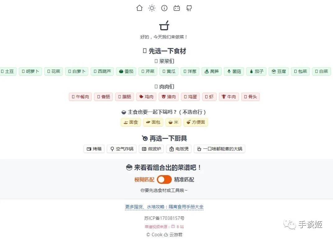 不过这个小工具毕竟是临时开发出来的,据作者说大约花了6小时吧,所以还是有很多细节可以优化。比如有的料理视频还涉及很多配料或许你没有;以及可勾选的食材不算多等。