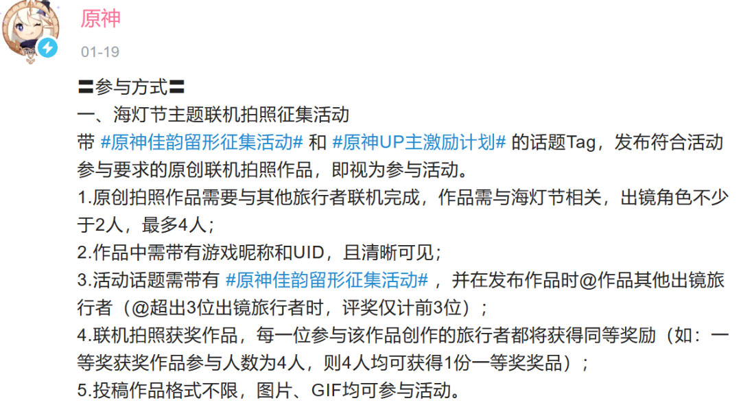 该瓜搬运自nga论坛,根据该网友介绍,《原神》在新版本中举办了一个“海灯节拍照活动”,相当于是一个通过用户创作分享来提高社区活跃度活动,参与的核心要求如下。