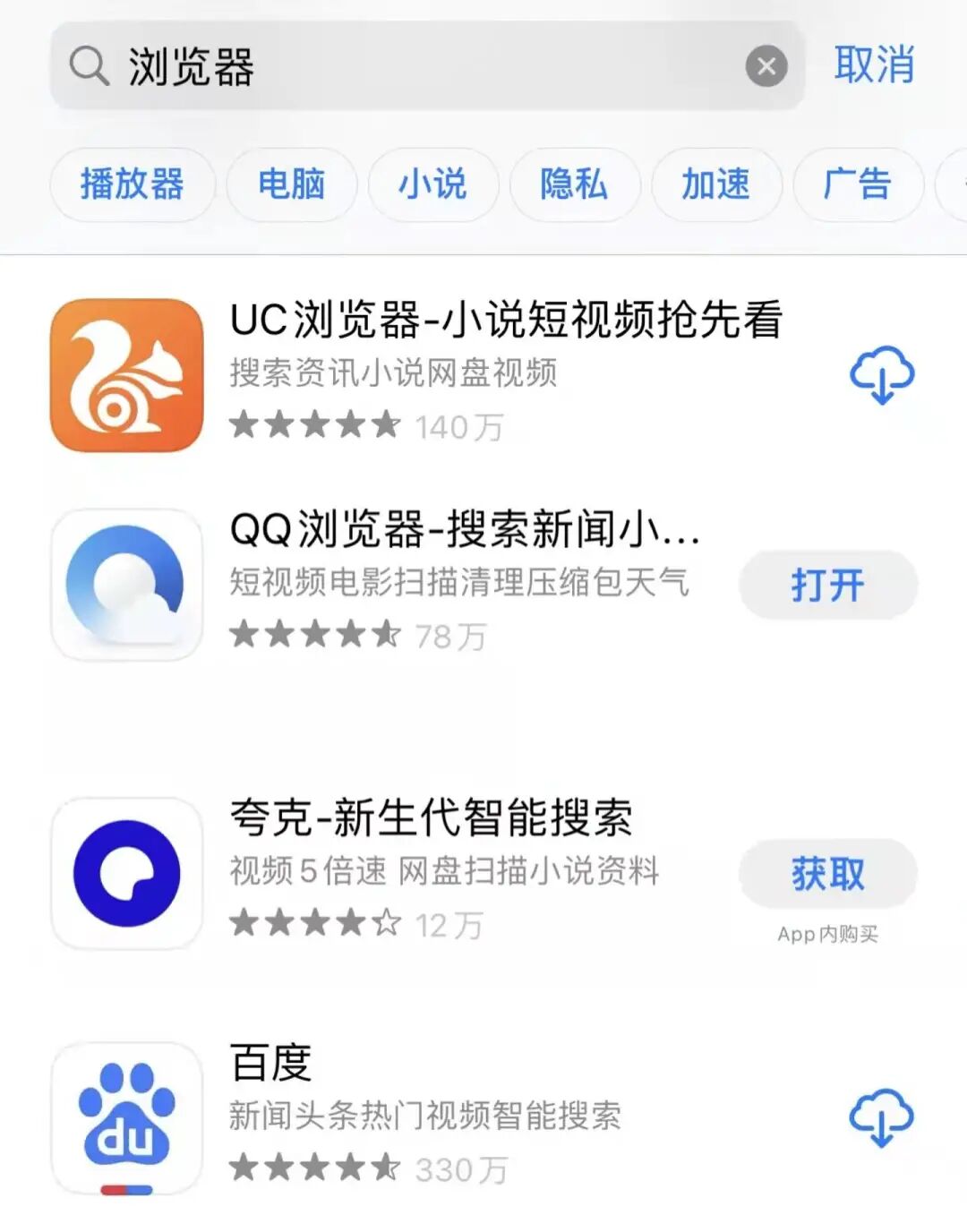 2月22日,在苹果应用商店中搜索“浏览器”,从上至下APP及其宣传语分别为:UC浏览器,小说短视频抢先看;QQ浏览器,搜索新闻小说文件;夸克,新生代智能搜索(视频5倍速,网盘扫描小说资料);百度,新闻头条热门智能搜索。