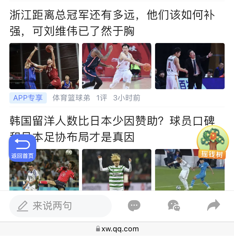 在浏览器打开腾讯网的某新闻链接,下拉底部信息流中的大多数内容均为“APP专享”