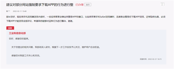 不为别的,该网友反映的问题,戳中大多数人的痛点:“现在用手机浏览器浏览内容时,一些应用常常会弹出推荐APP的窗口……必须下载APP才能浏览全部评论……”