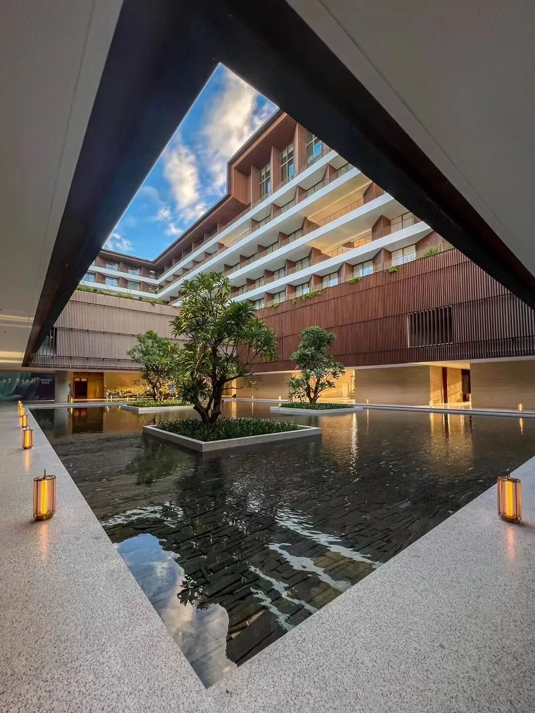 设计精彩之处比比皆是,我最喜欢的莫过于大堂的“水院”:“水院”由两座L型主楼交错连接而成的,其他公共空间则都围绕着水院蜿蜒展开,既有“院”的庄重,又兼具“水”的灵动,颇有中式园林意境,是酒店设计的点睛之笔。