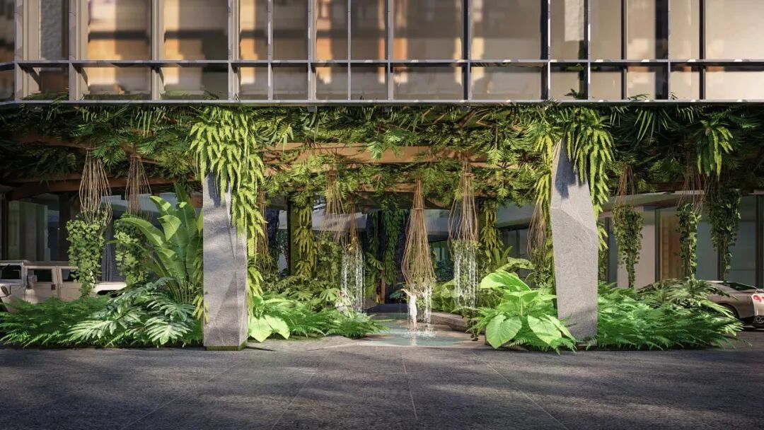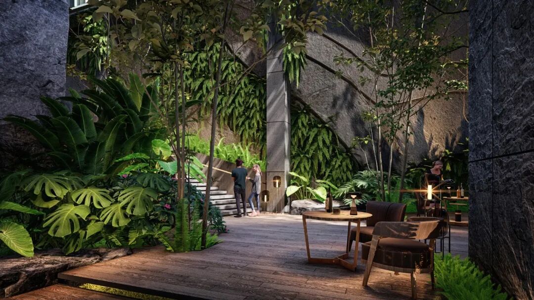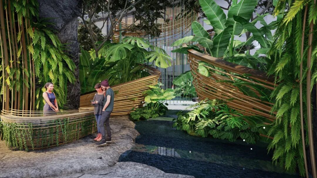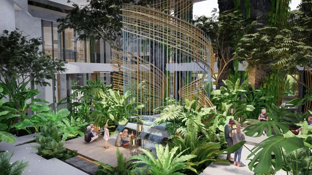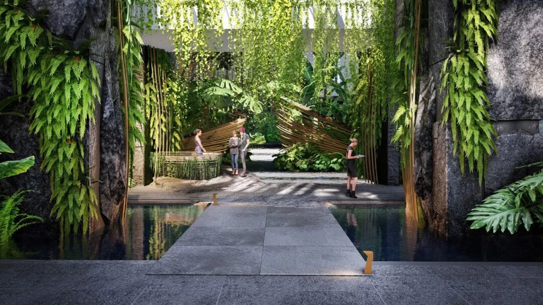 茂密的植物恣意生长,结合倾泻而下的水瀑、自然堆叠的石块,穿梭在峡谷之间,沉浸式感受雨林的魅力。居于此,聆听雨打芭蕉的声音,你不仅会被热带雨林所包裹,还会有淙淙的溪水流过,一呼一吸之间尽是自然的气息。
