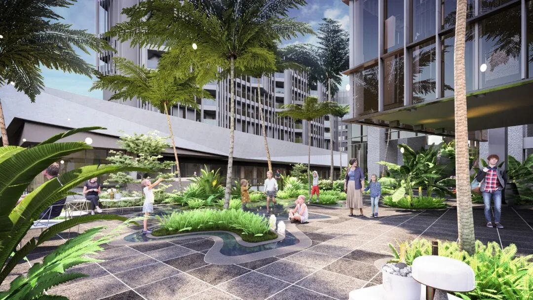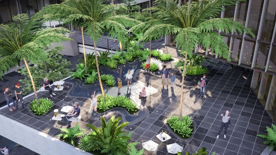 雨林的“灵动”,在丛林浅滩深深浅浅的流露。在桫椤树的掩映下,围起一弯浅滩,水清见底,流淌在二楼商业外延空间,还有设定的视线角度与停留点,增强空间互动性,形成更加丰富的空间感受。