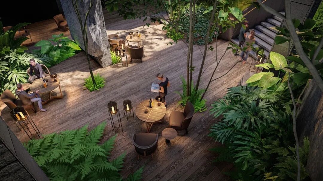 酒店的垂直布局层次分明,与戏水池东西相接的是餐厅后花园,通过融入芭拉湖的景色,使藏在繁茂雨林植物后里的“秘密花园”,成为到访者茶餐后恣意舒缓心境之地。