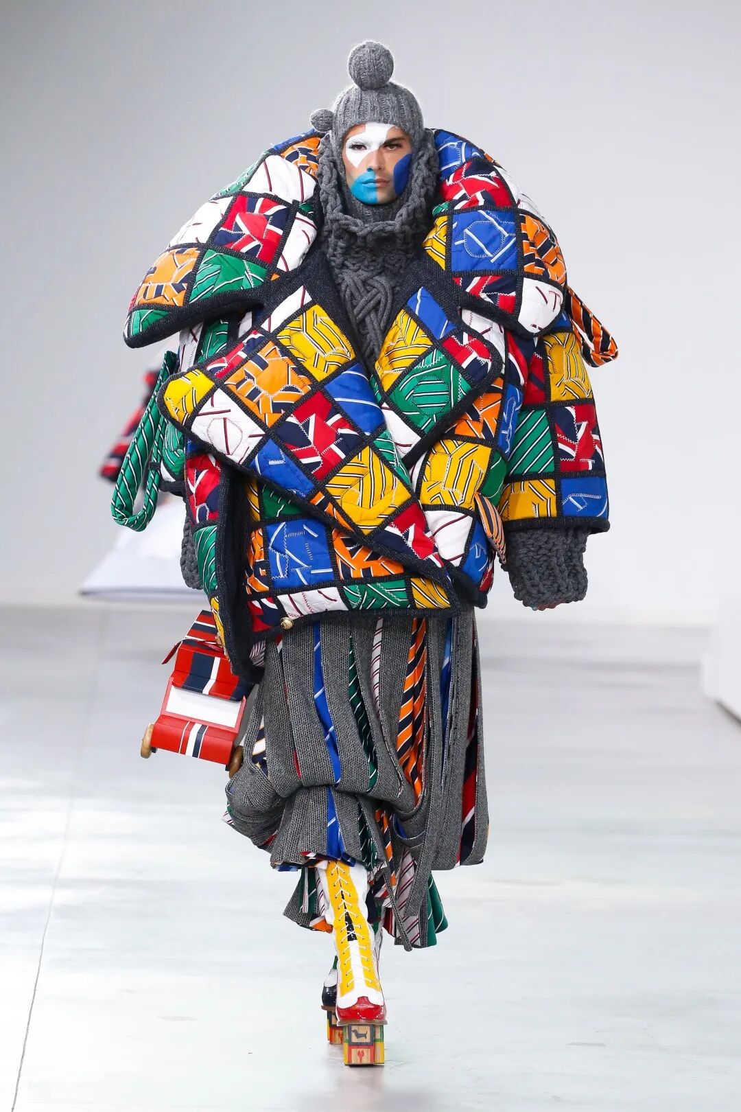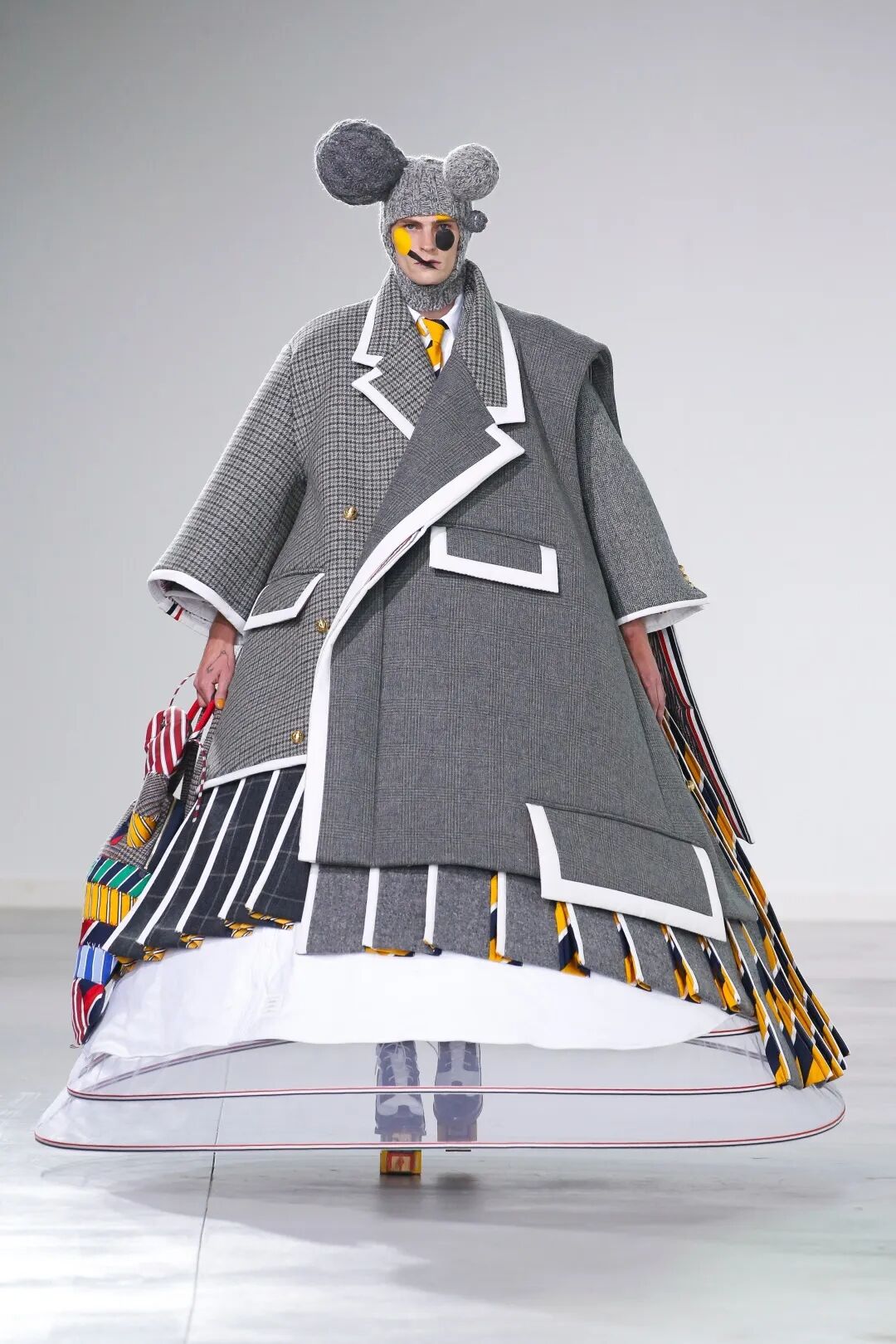 设计师将系列分为两个Part,前24套服装是Thom Browne裁剪的“现实”版本,后24套服装是他们的“概念”版本,鼓鼓的、古怪的,以表达个性和自我表达的真实性。