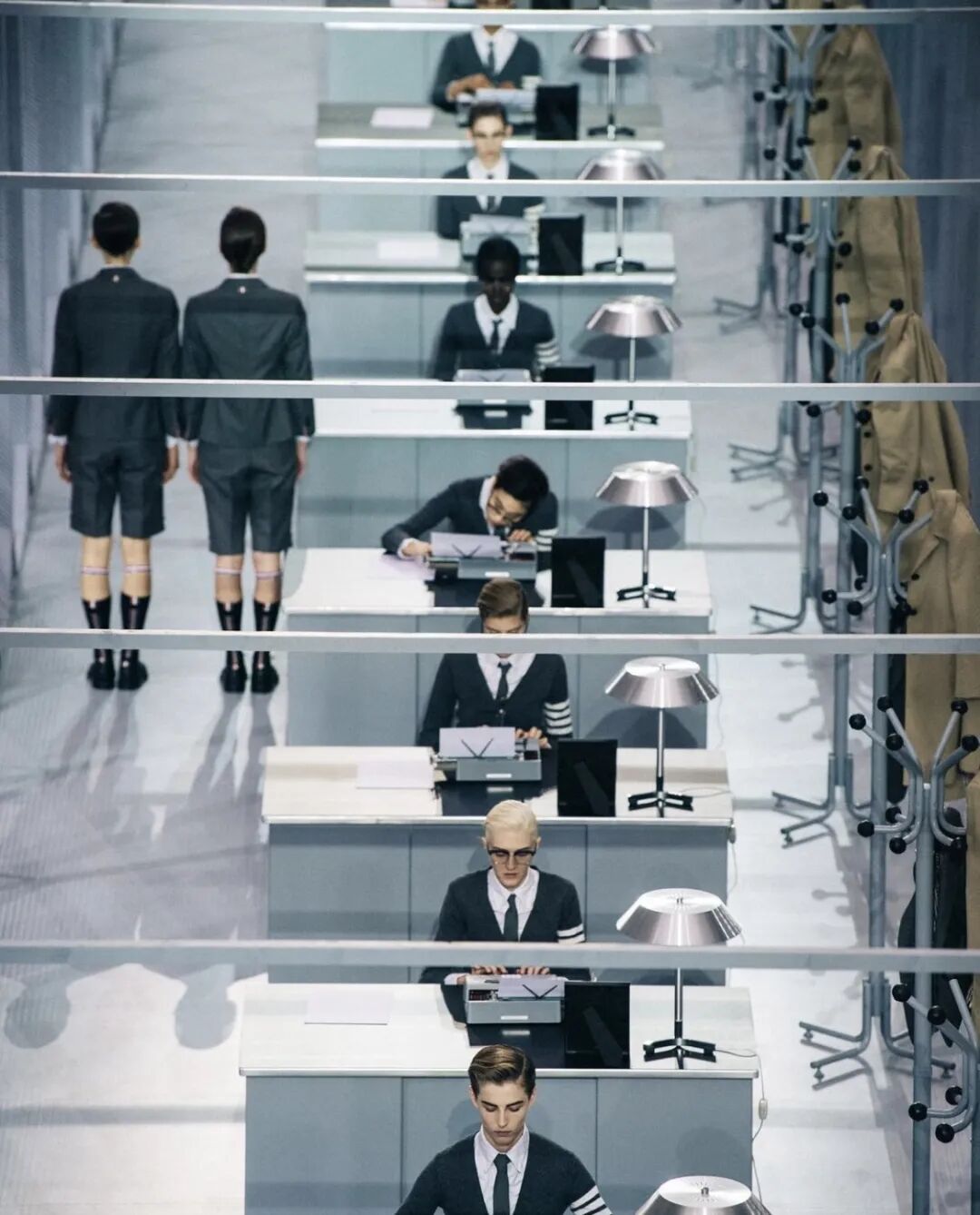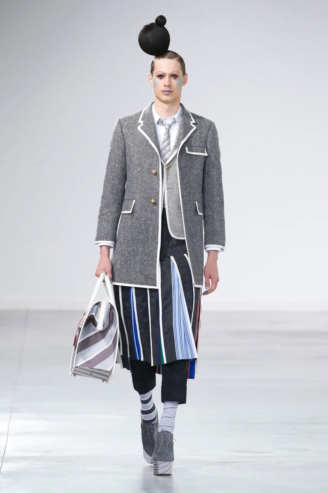 Thom Browne总喜欢用荒诞的手法处理设计,有时像“不正经”西服专业户,有时是缩水正装爱好者,总是在这个颠倒的世界中,那些意料之外也可以在情理之中。