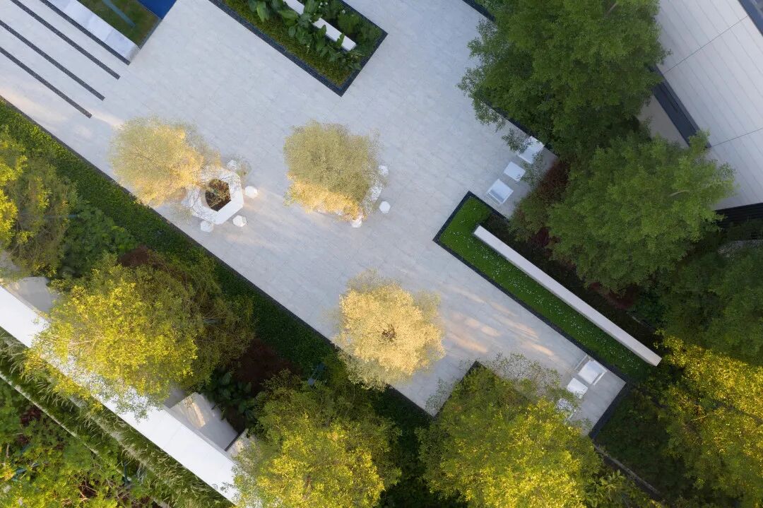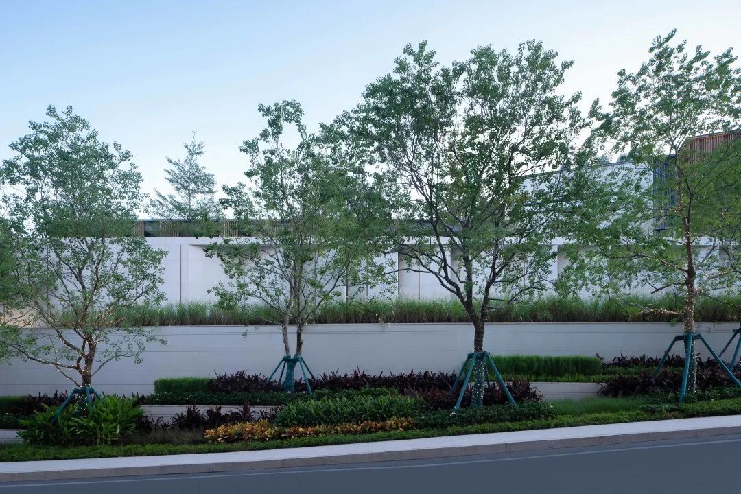 前场空间,以干净肃穆的建筑外立面结合浓郁热烈的阔叶地被,外加造型独特的点景乔木,营造出景观的现代感、艺术感、仪式感。进入水景中心,花境绿岛的处理手法,让整个静谧的硬质空间,被自然的形态、色彩软化边界,与空间的感知,融为一体。