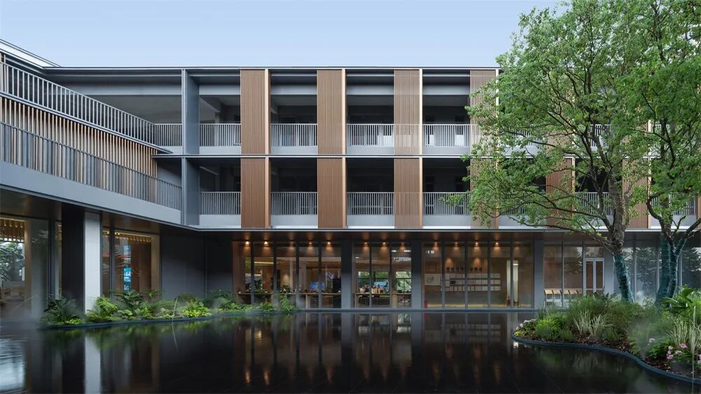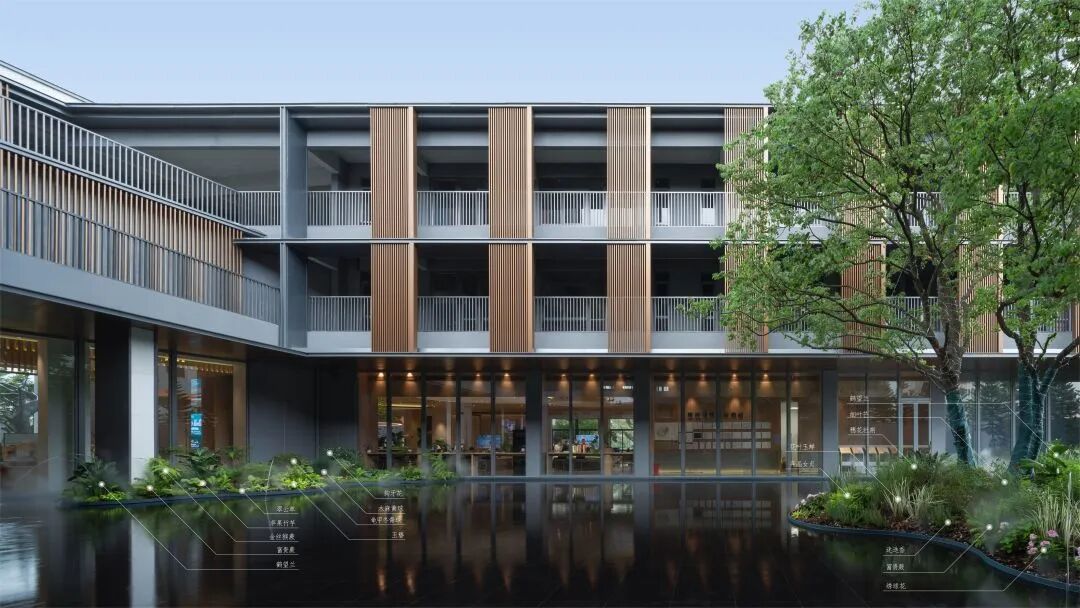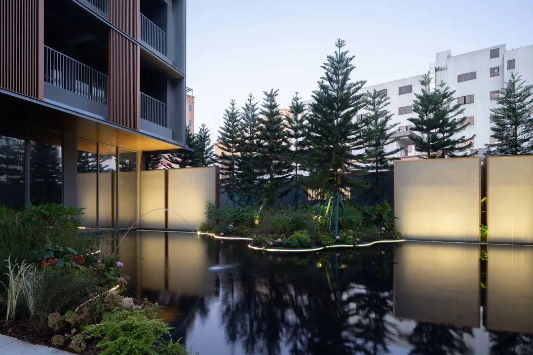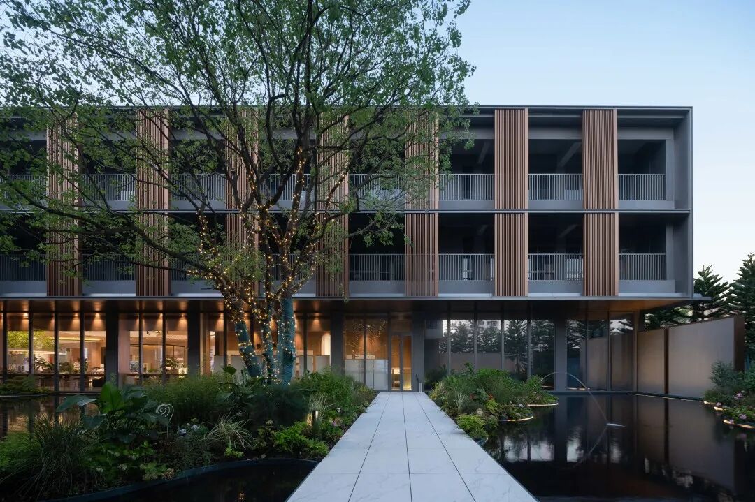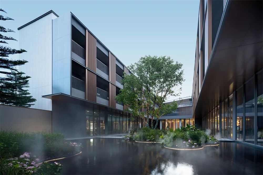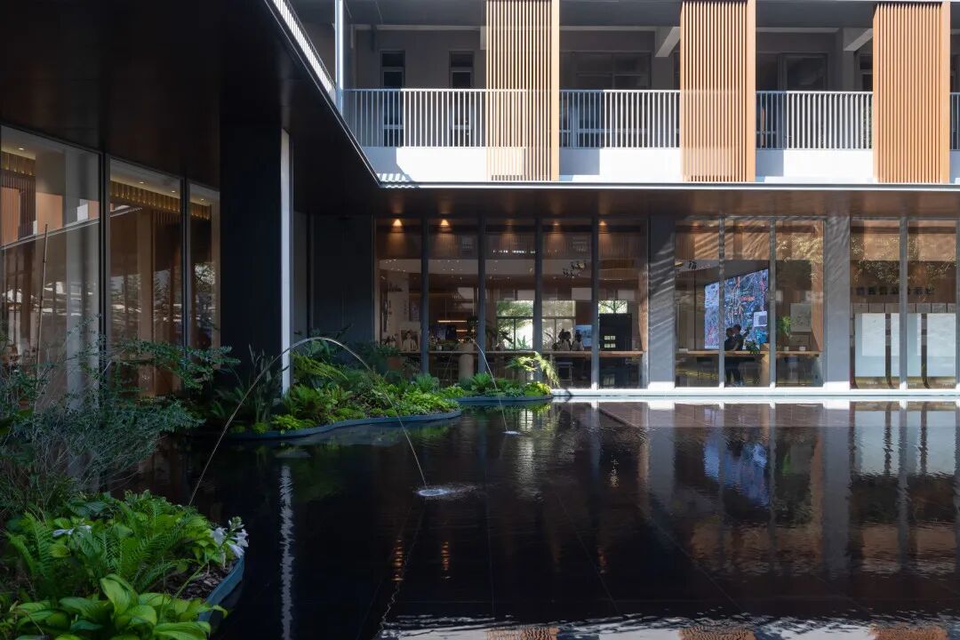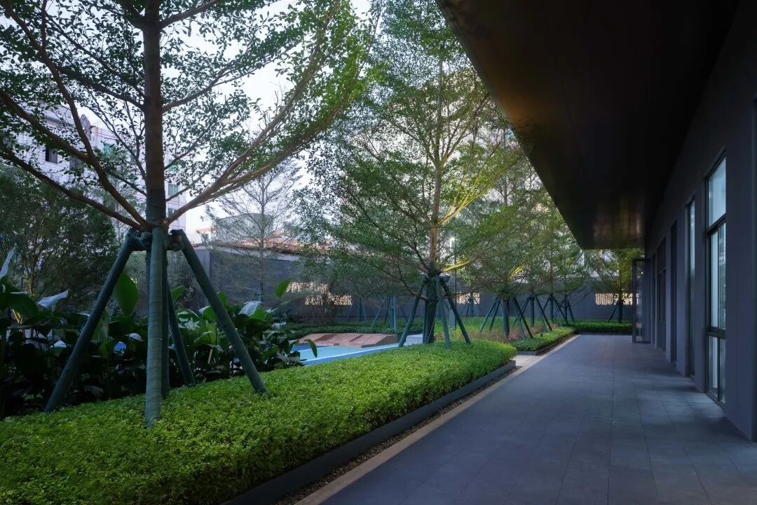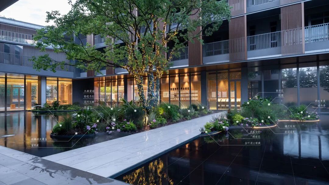 点景乌桕,迎风而动,松弛而自然的舒展枝叶,与水景,构成一幅森溪密林的自然图景。三面建筑幕墙围合,光影与草木相互映衬,疏影横斜,静水清浅,行走其中,感受一泓幽深静谧的森活美景。