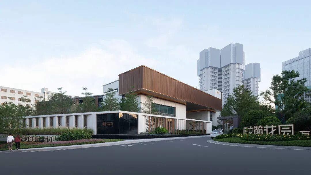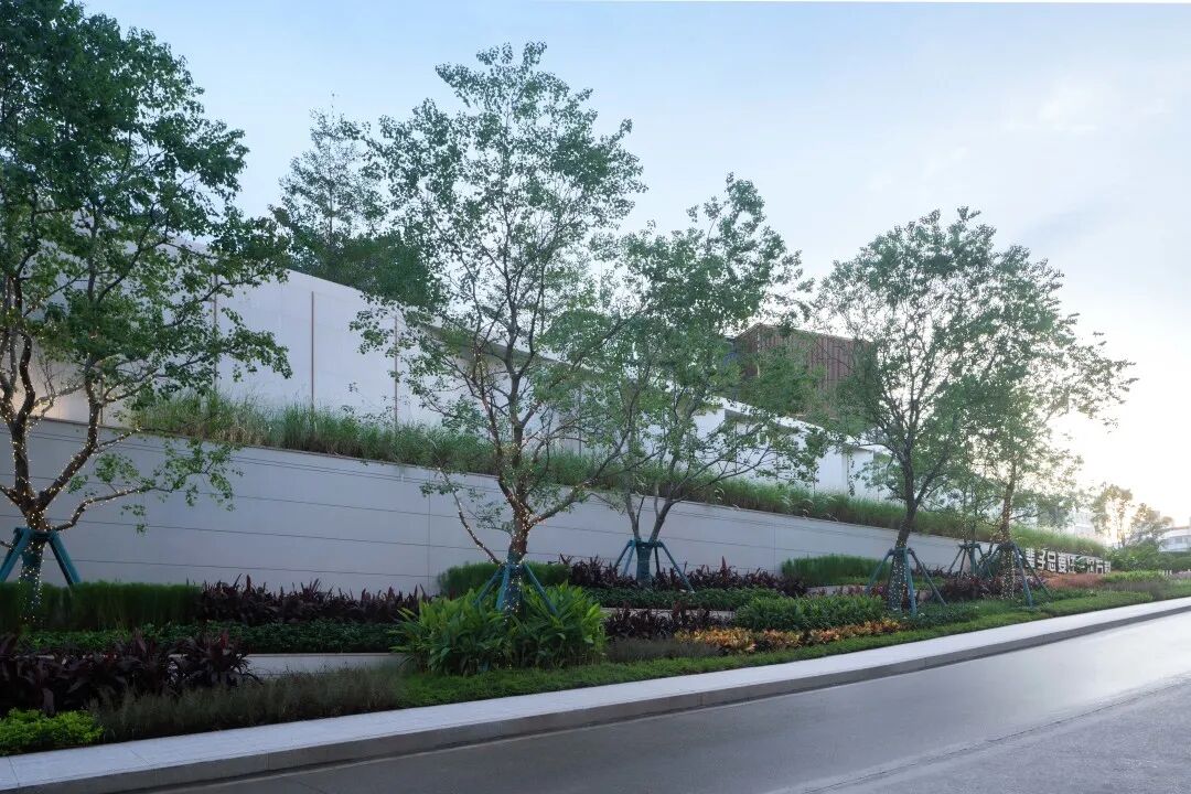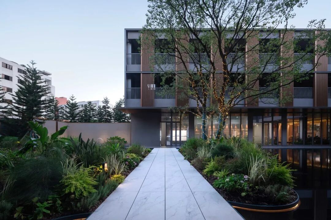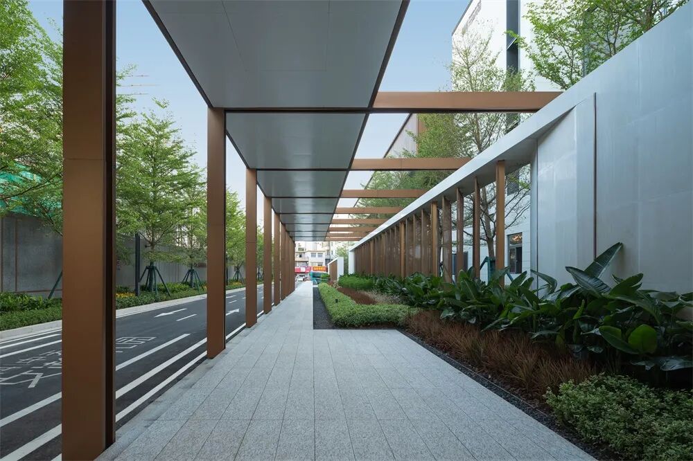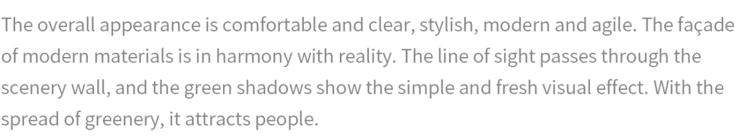整体外观舒朗清晰,时尚现代又不失灵动,现代材质的立面虚实相生,视线透过景墙,绿影绰绰,彰显简洁、清新的视觉效果,随着这片蔓延的绿意,吸引人向前探寻。