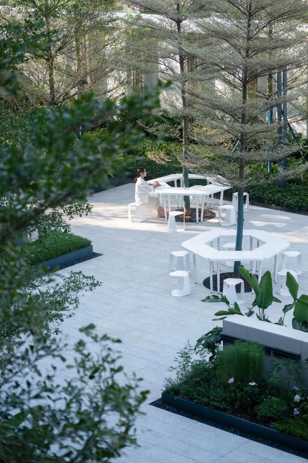 中庭是该空间的亮点,设计希望此处能够构成一处永续生机的绿岛。大面积水景令整个空间清逸而沉静,堆坡构筑的绿岛散落各处,绿岛通过水环境和植物构成小型的微气候空间。阳光、空气的融入,让整个场景空间生机勃勃。
