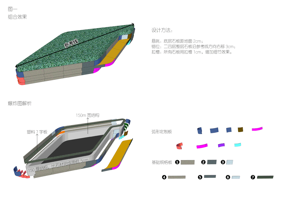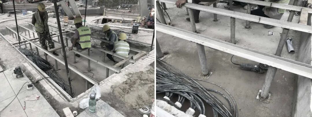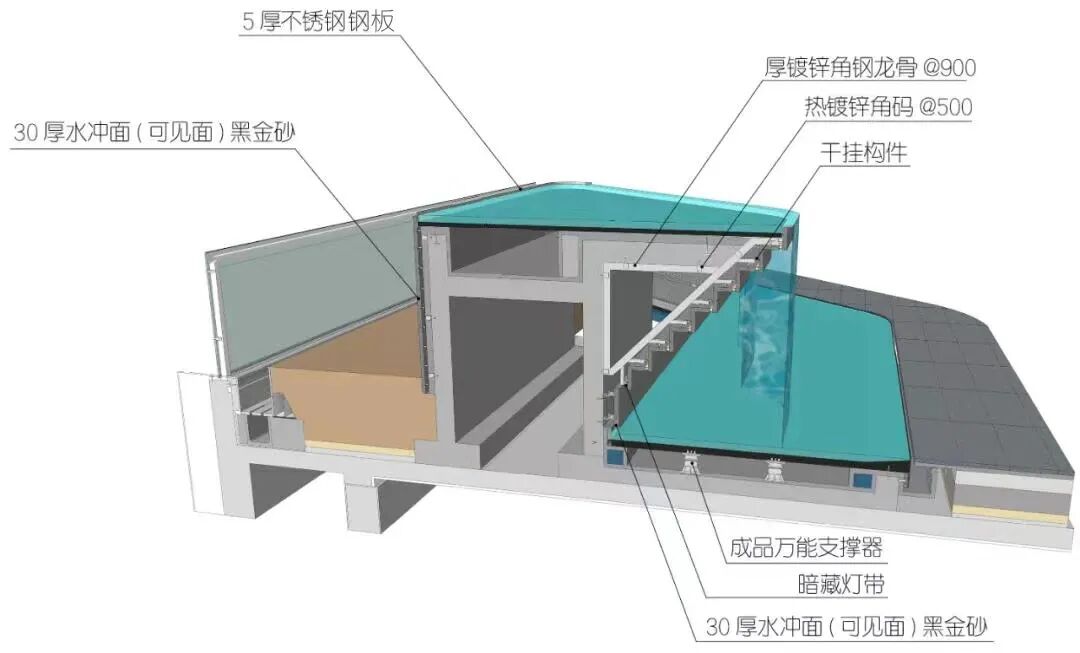通过万能支撑器架空石材,各石材之间有5-10mm的出水缝隙,水通过缝隙均匀的进行循环,达到静水面的效果。为了防止石材反碱,在做好石材的防护、粘结剂的选择常规动作的同时,架空技术的使用,从根源上隔离石材与基层。