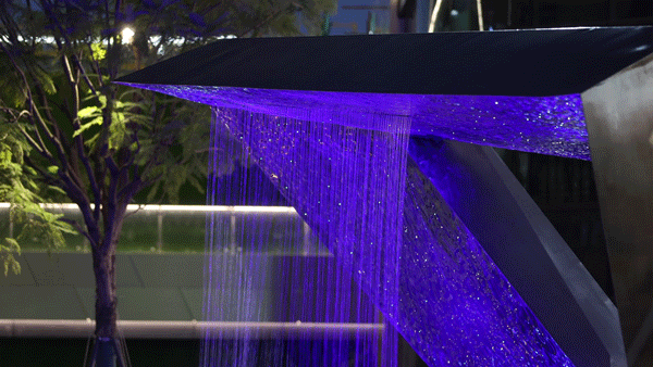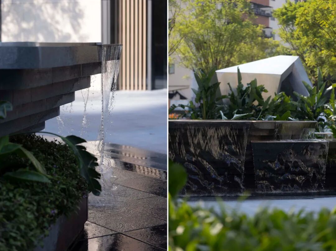 选用水波纹镜面不锈钢材质,与地面水景交相呼应,赋予空间以温度,令整体环境更显柔和。