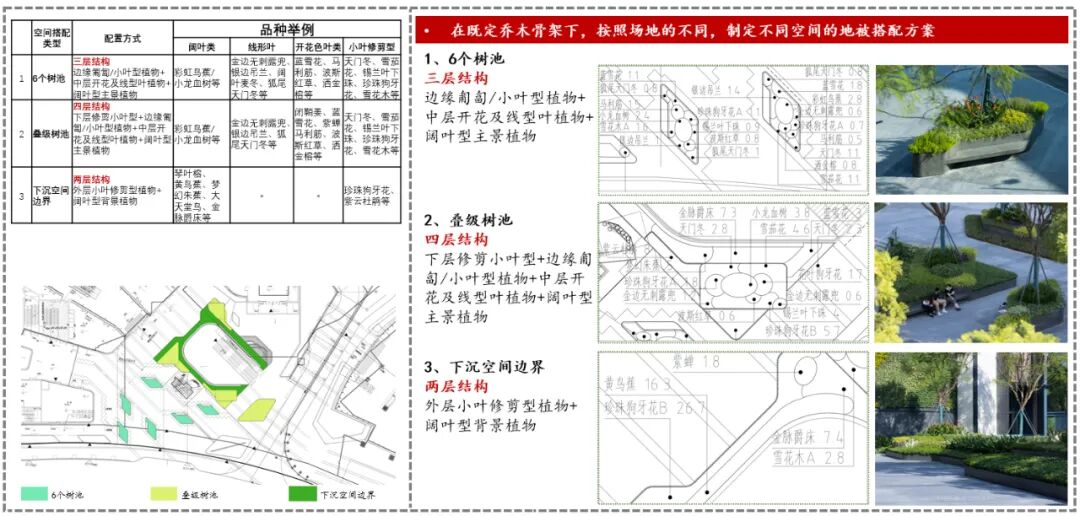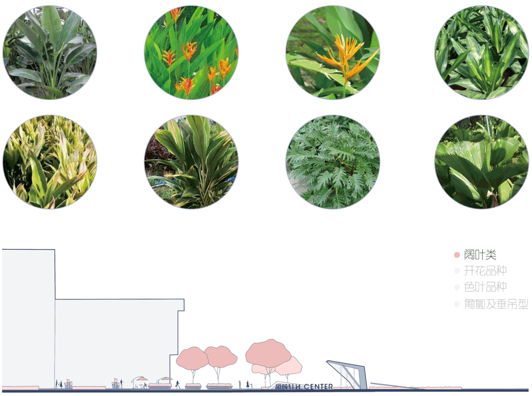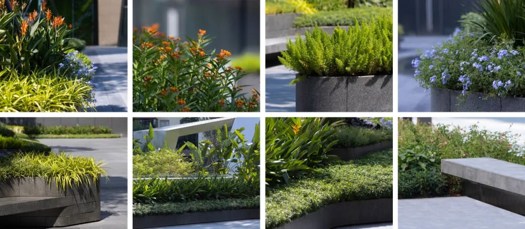 为适应场地的光照条件,并创造一个具有雨林特色的植物氛围,设计共选用36种植物进行搭配,运用了丰富的阔叶品种,如:大天堂鸟、黄鸟蕉、彩虹鸟蕉、梦幻朱蕉等,同时运用绚烂色彩的开花及色叶植物为场地装点颜色,并结合叠级花池种植匍匐及垂吊植物,打造更自然的植物层次。